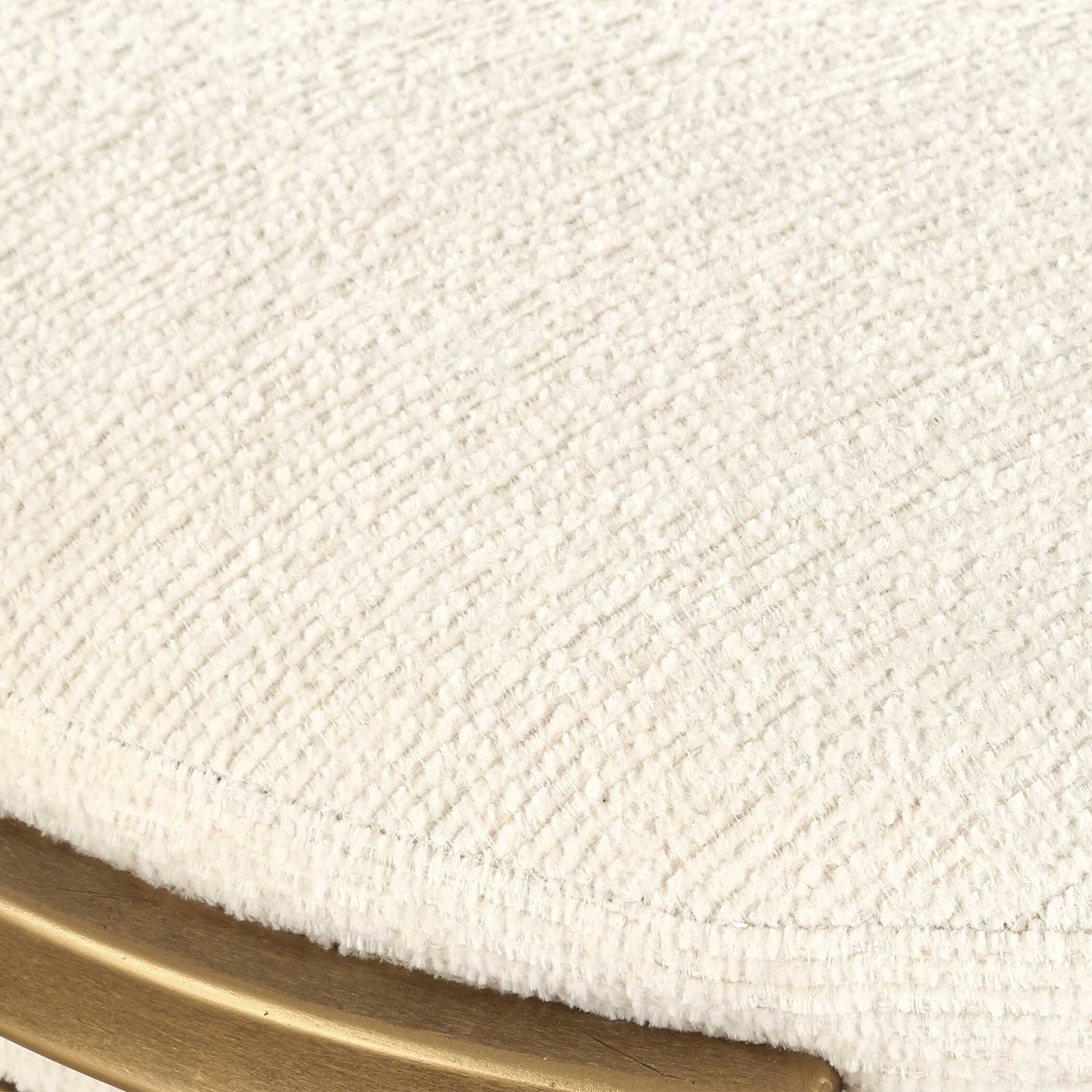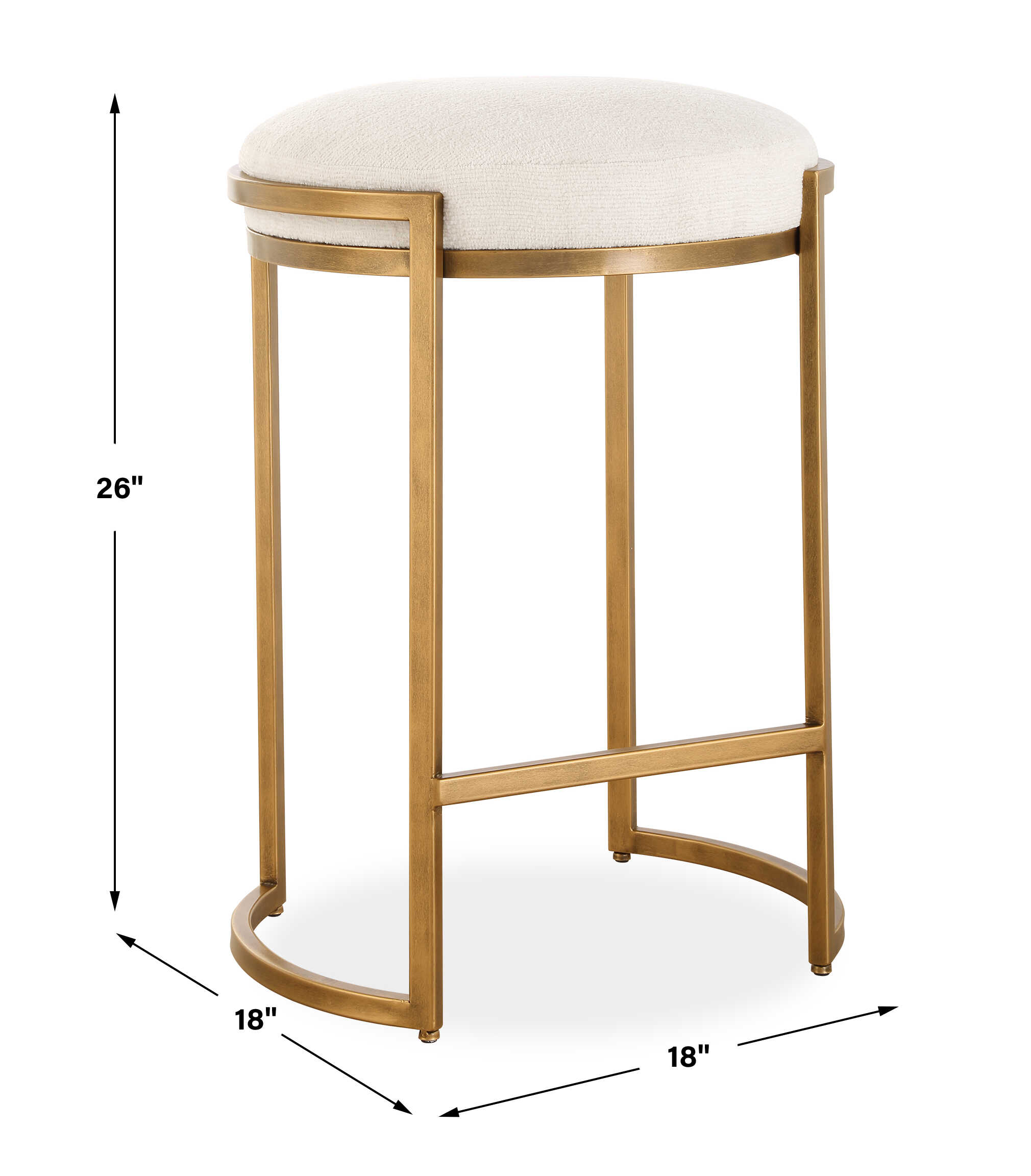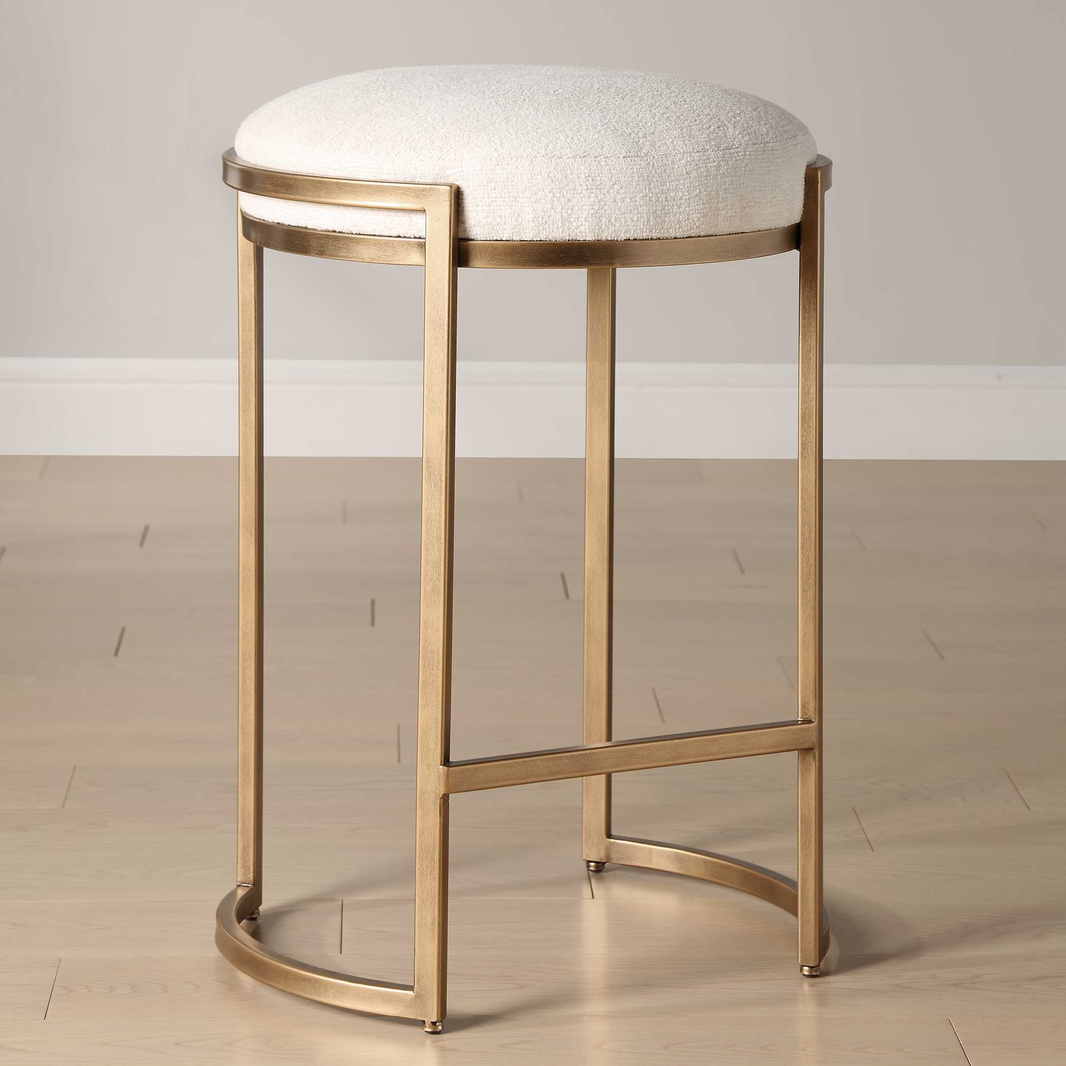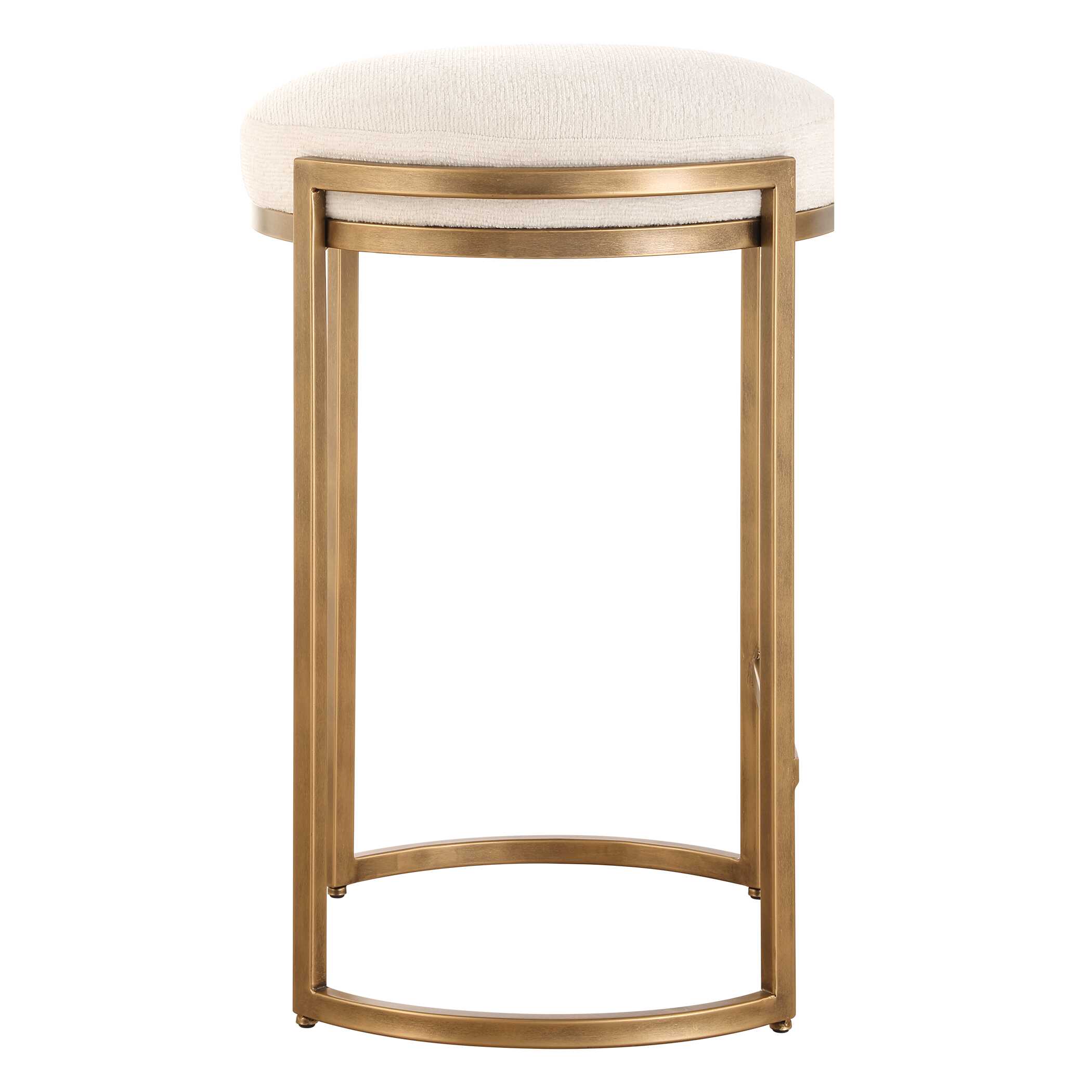 The clean lines of this 26" high counter stool are made of iron and finished in an antique brushed brass. A textured, light cream performance fabric complements the simple frame.