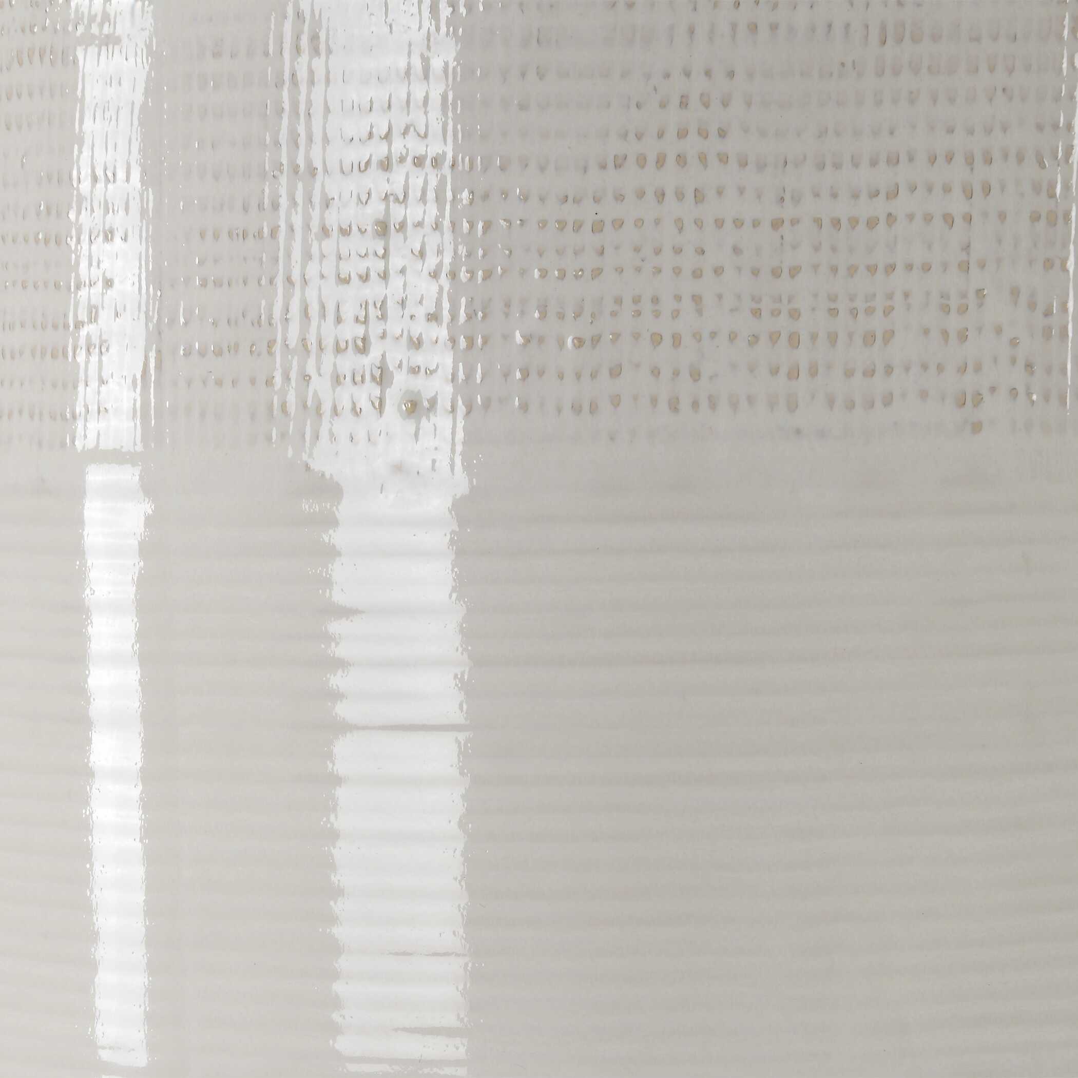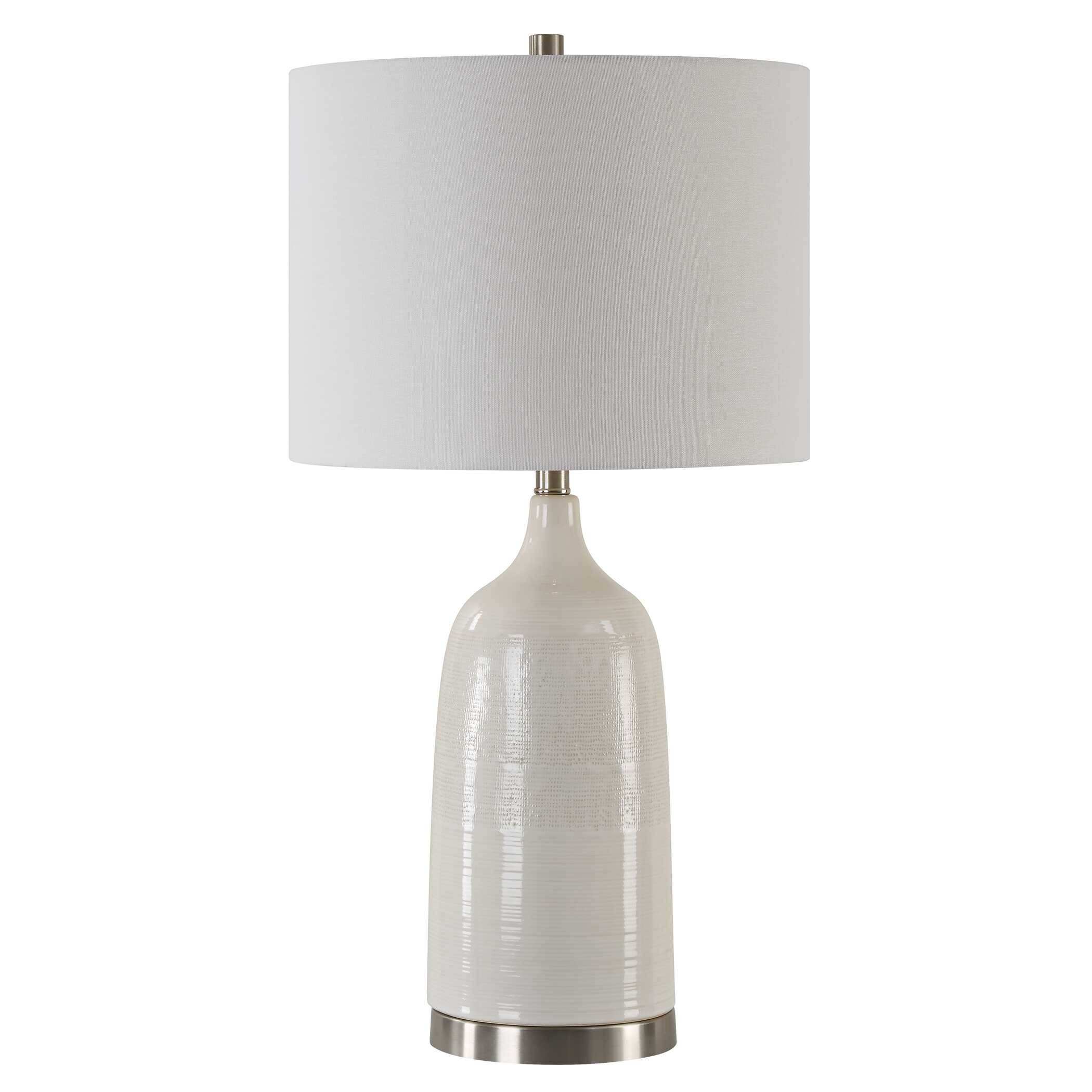 This organic shaped porcelain ceramic table lamp has a textured body, finished in an antique white wash, with brushed nickel accents. The drum hardback shade, with rolled edges, is an off white linen fabric.