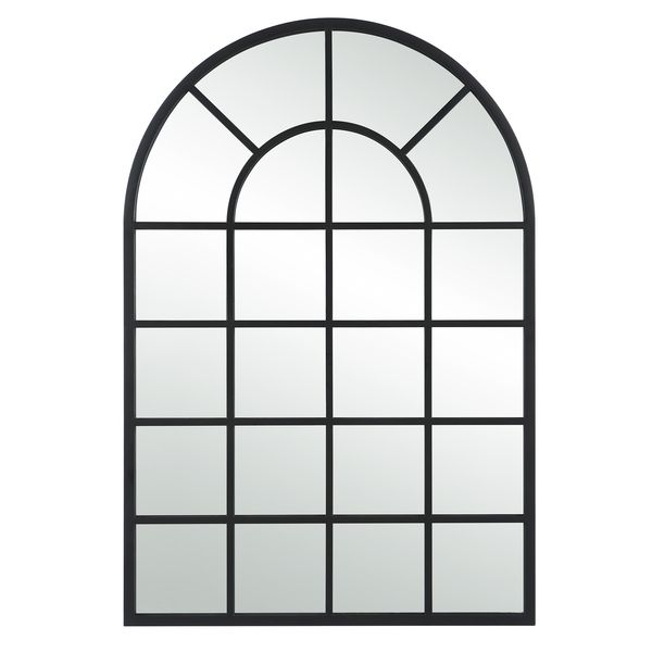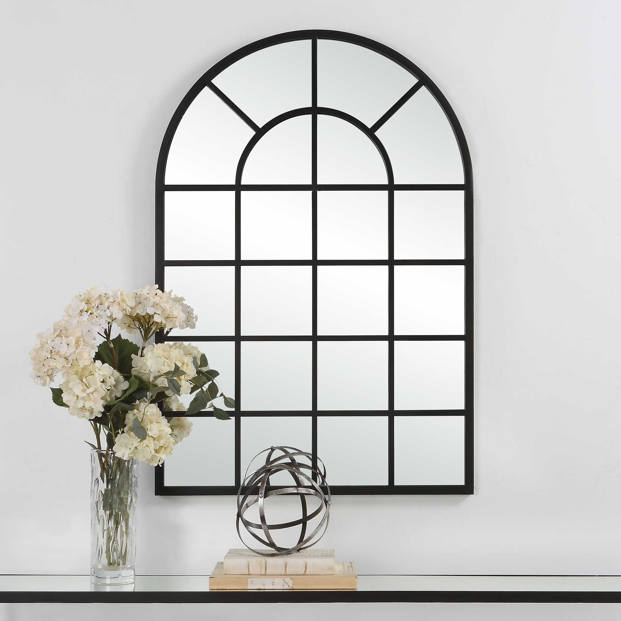 Featuring a gracefully arched top and bottom with sleek, straight sides, this mirror is a perfect blend of contemporary style and classic charm. The iron frame, finished in a warm brushed gold, surrounds a floating mirror, appearing as though it is suspended within the frame. May be hung either vertically or horizontally.