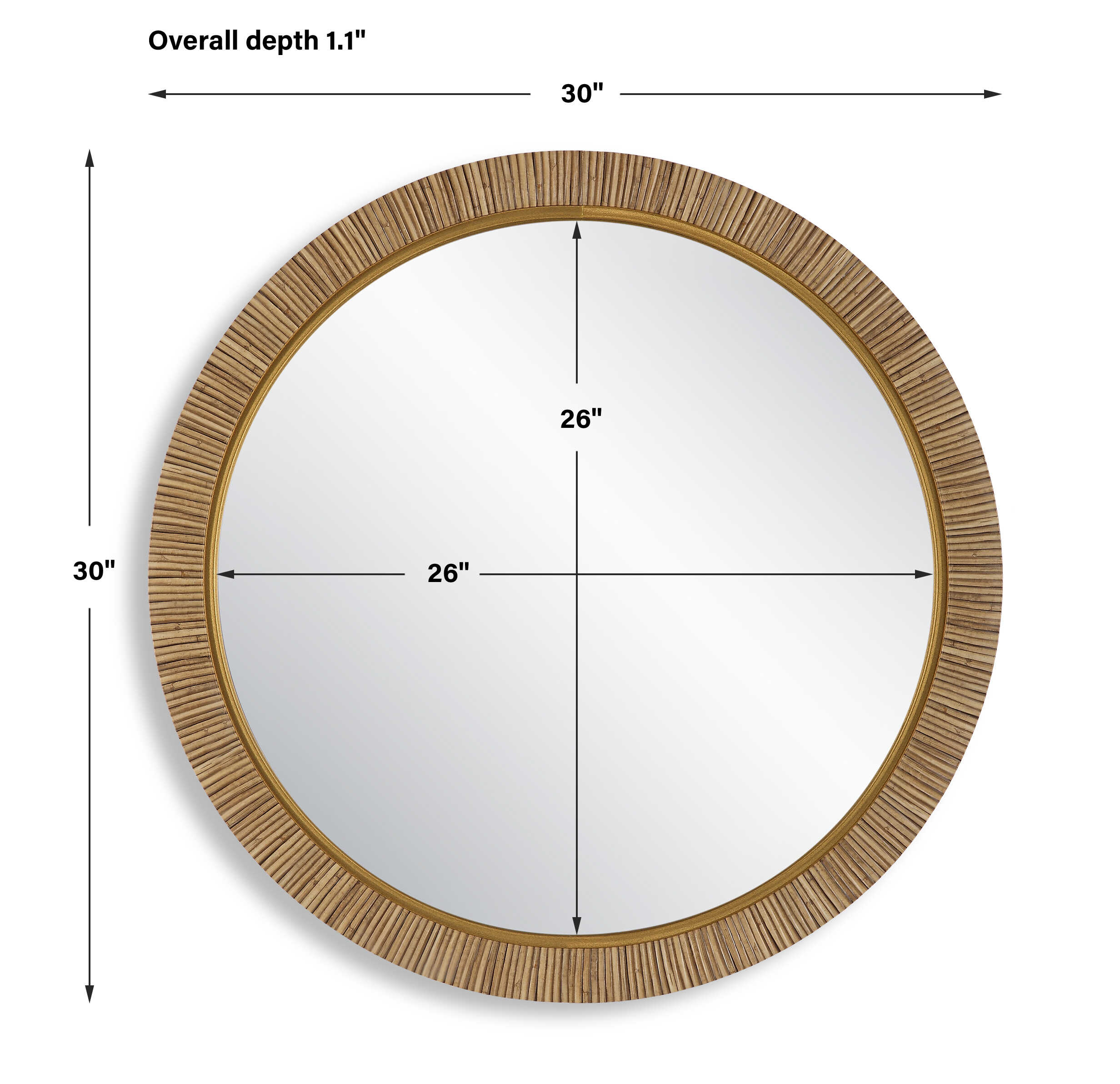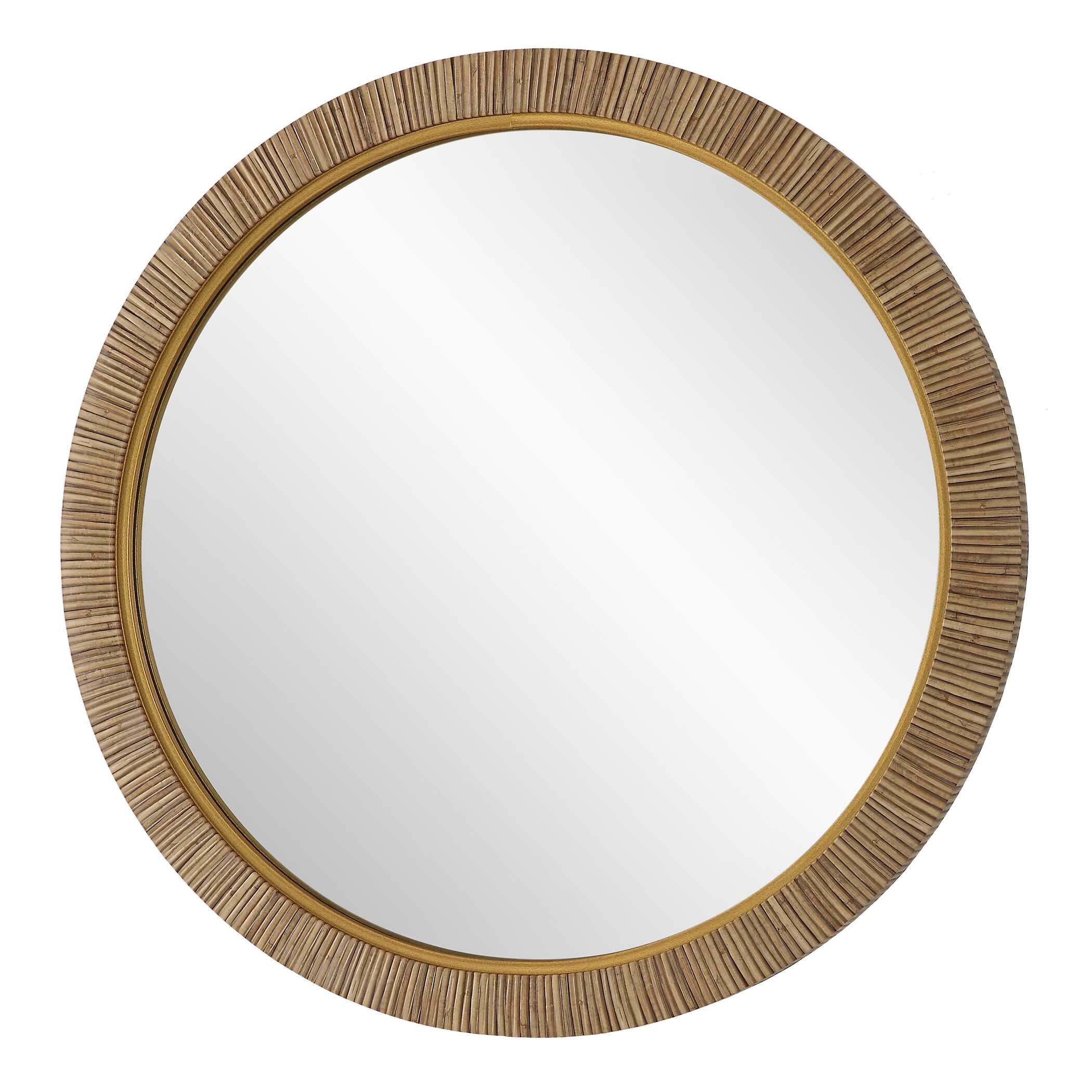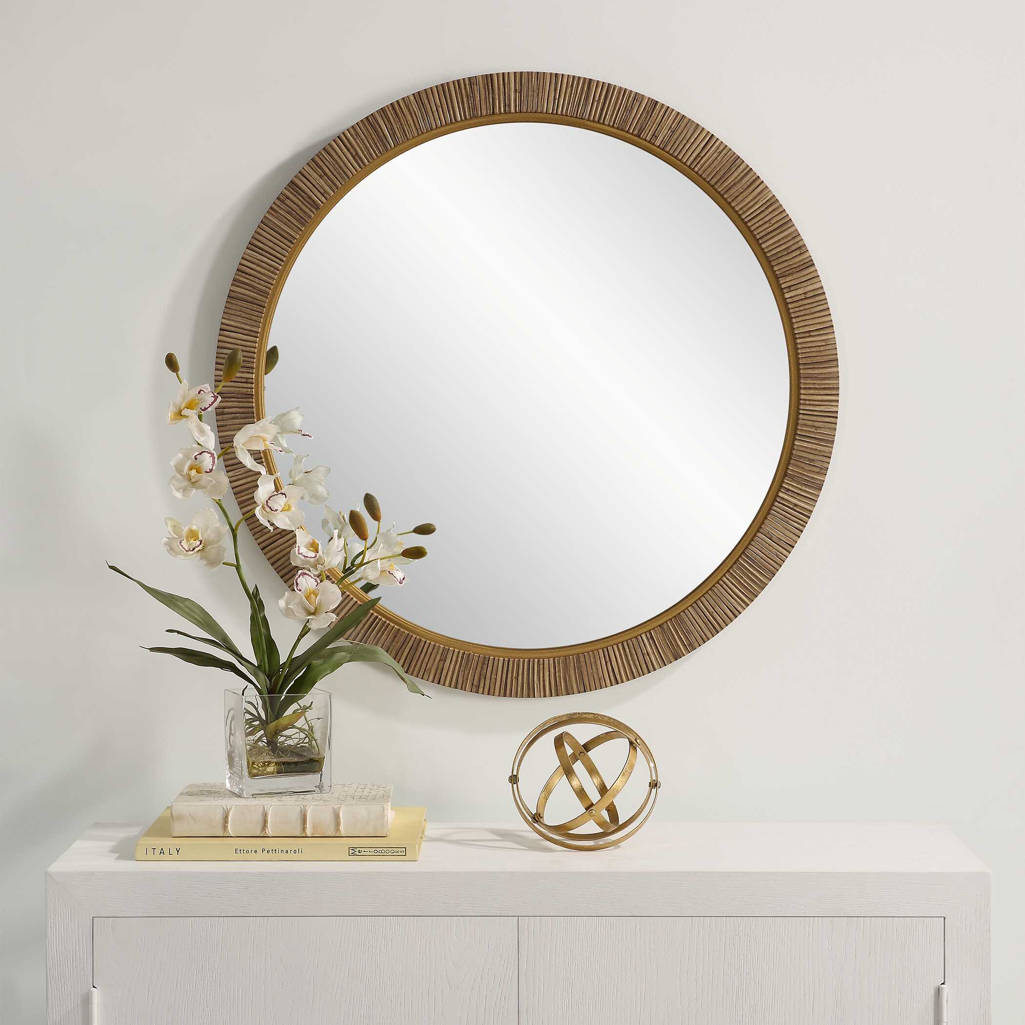 This 34" round mirror, made of aluminum, is finished in a brushed gold. Whether you are updating a foyer or a bathroom, the simple, clean design will give any space a refreshed look.