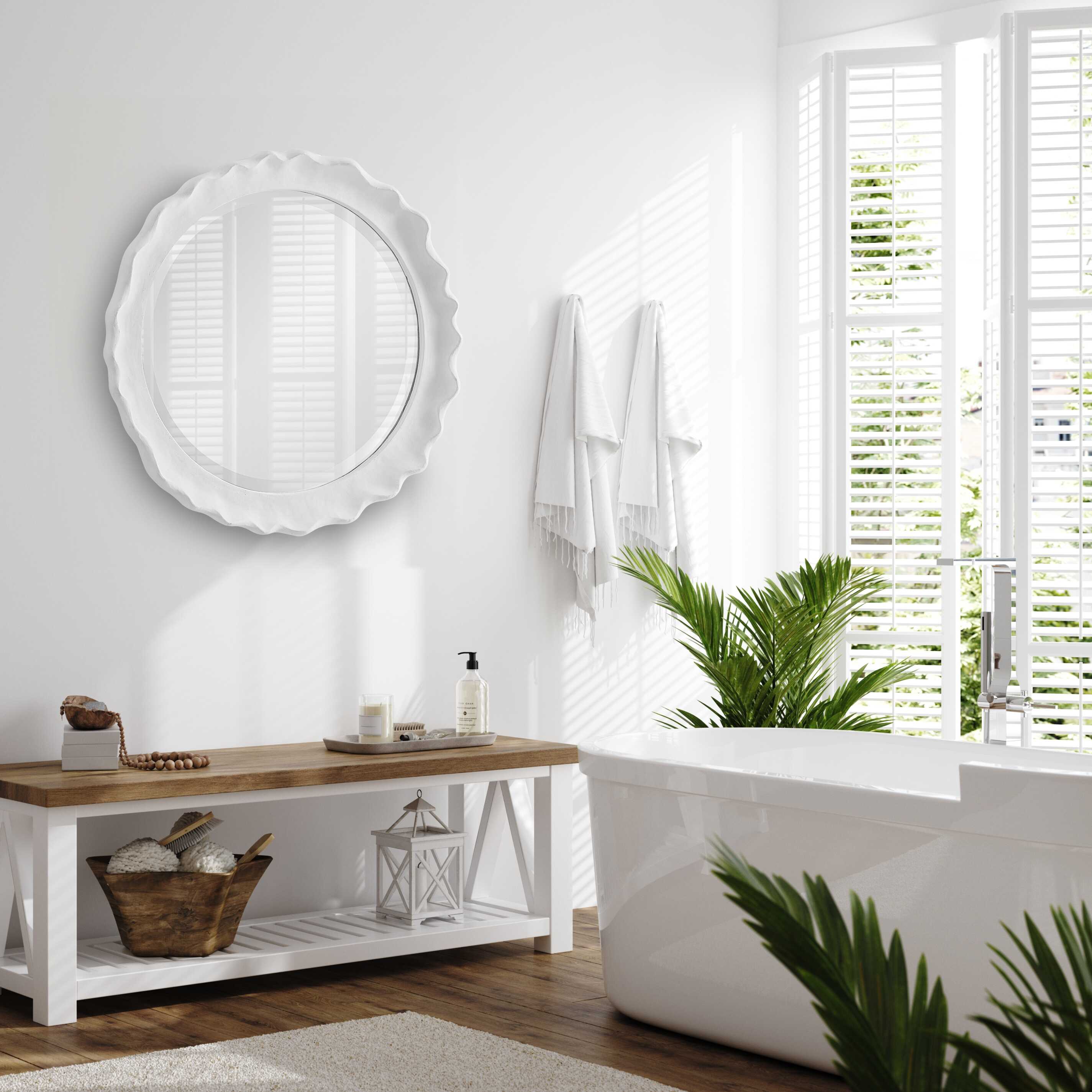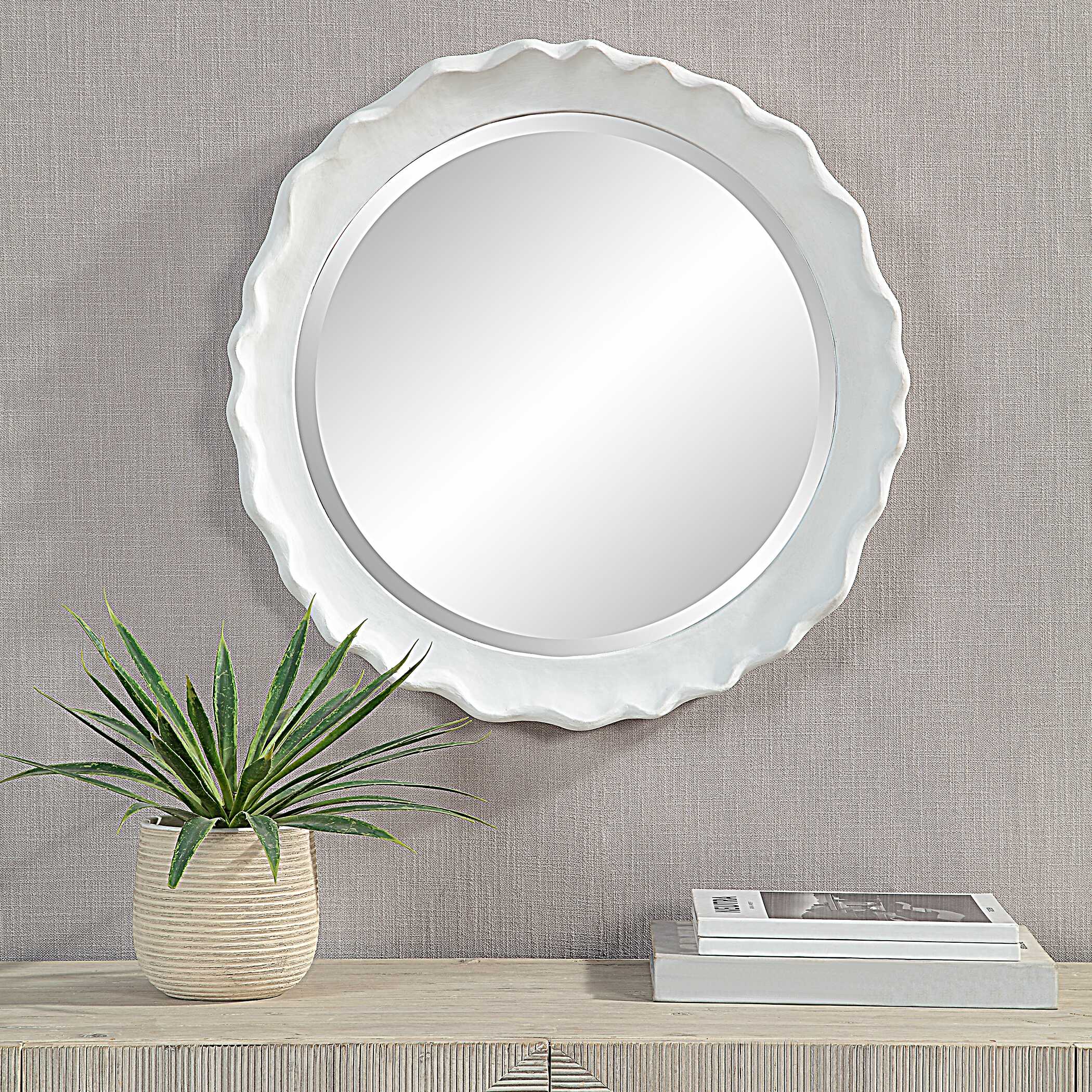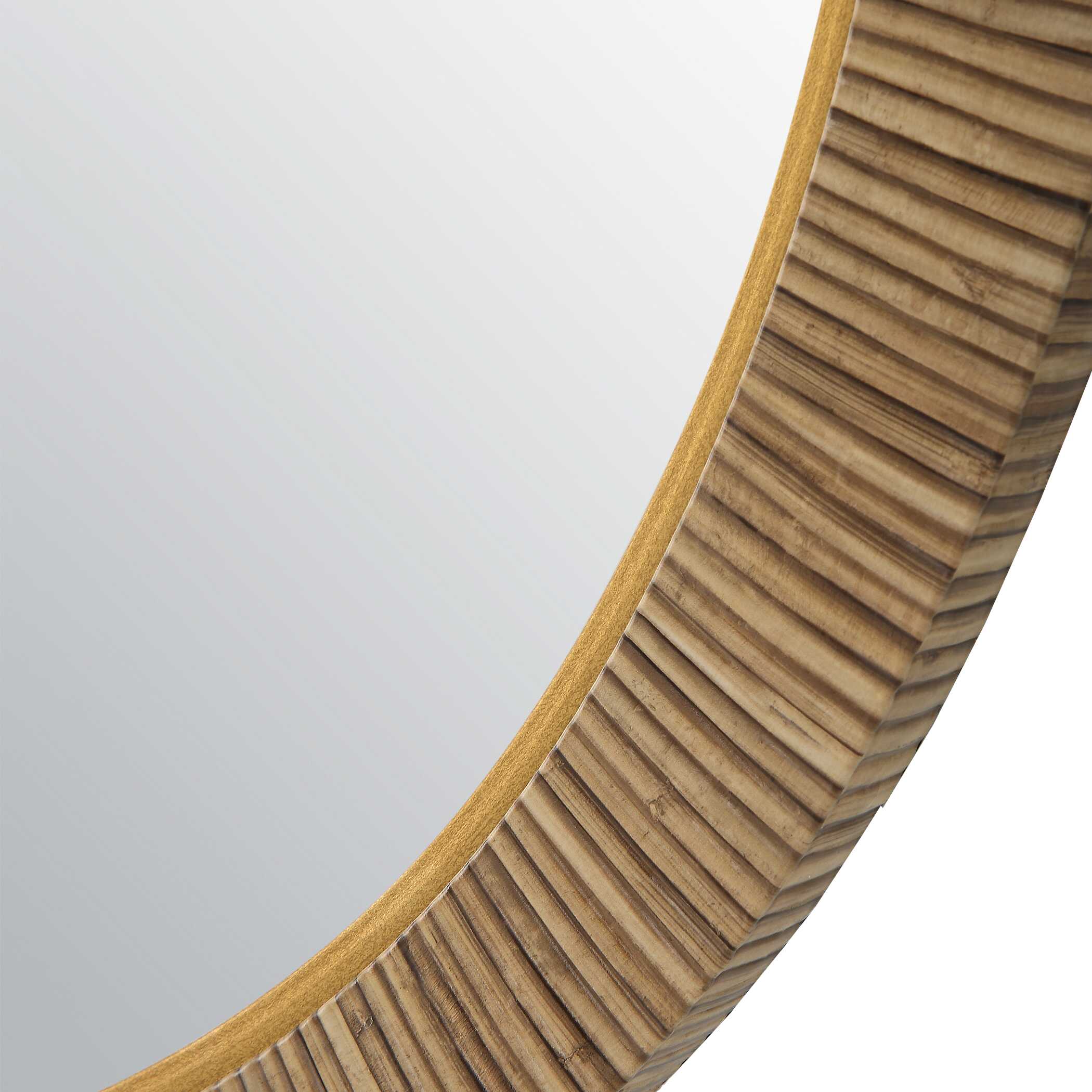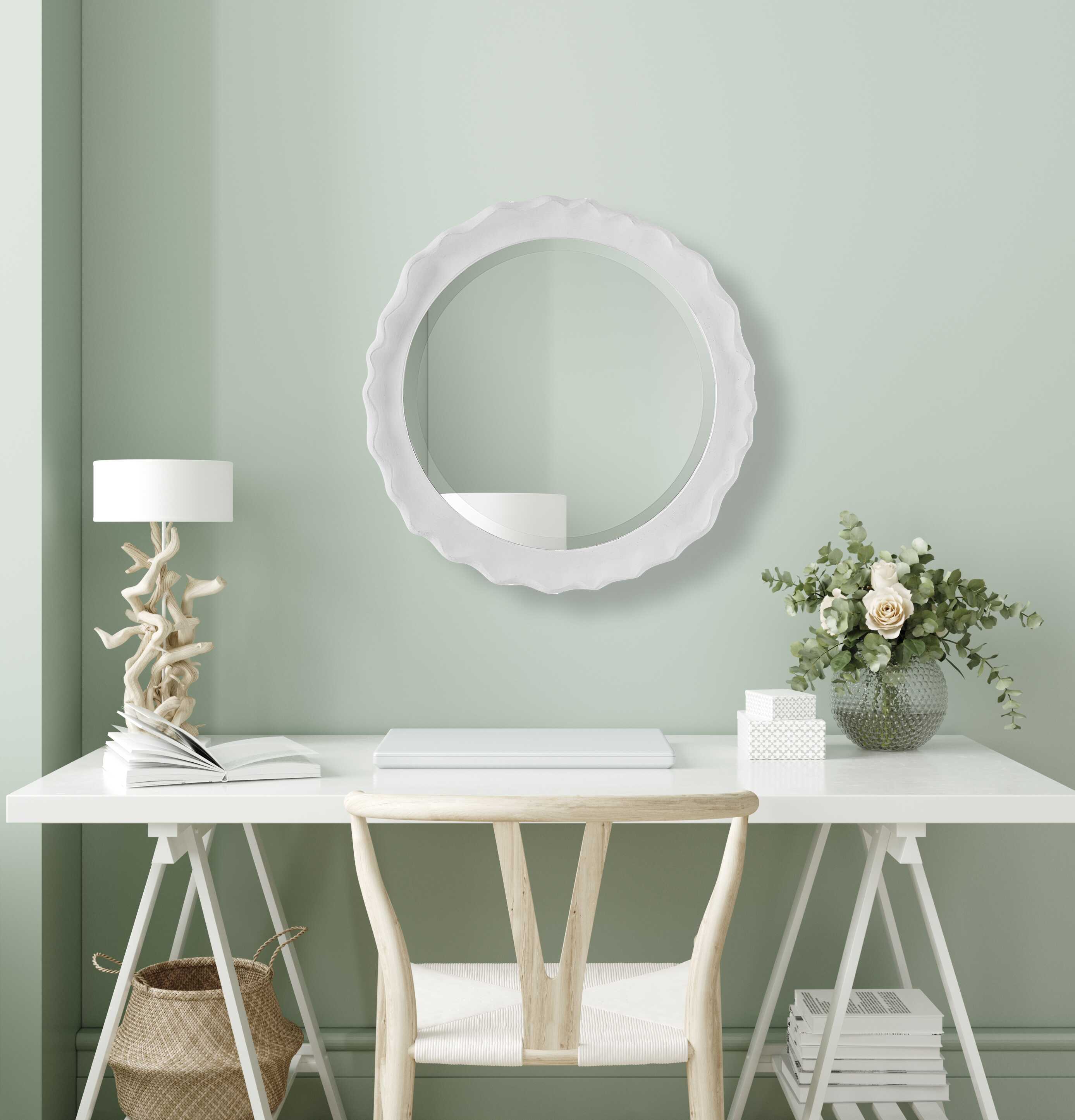This 34" round mirror, made of aluminum, is finished in a brushed gold. Whether you are updating a foyer or a bathroom, the simple, clean design will give any space a refreshed look.