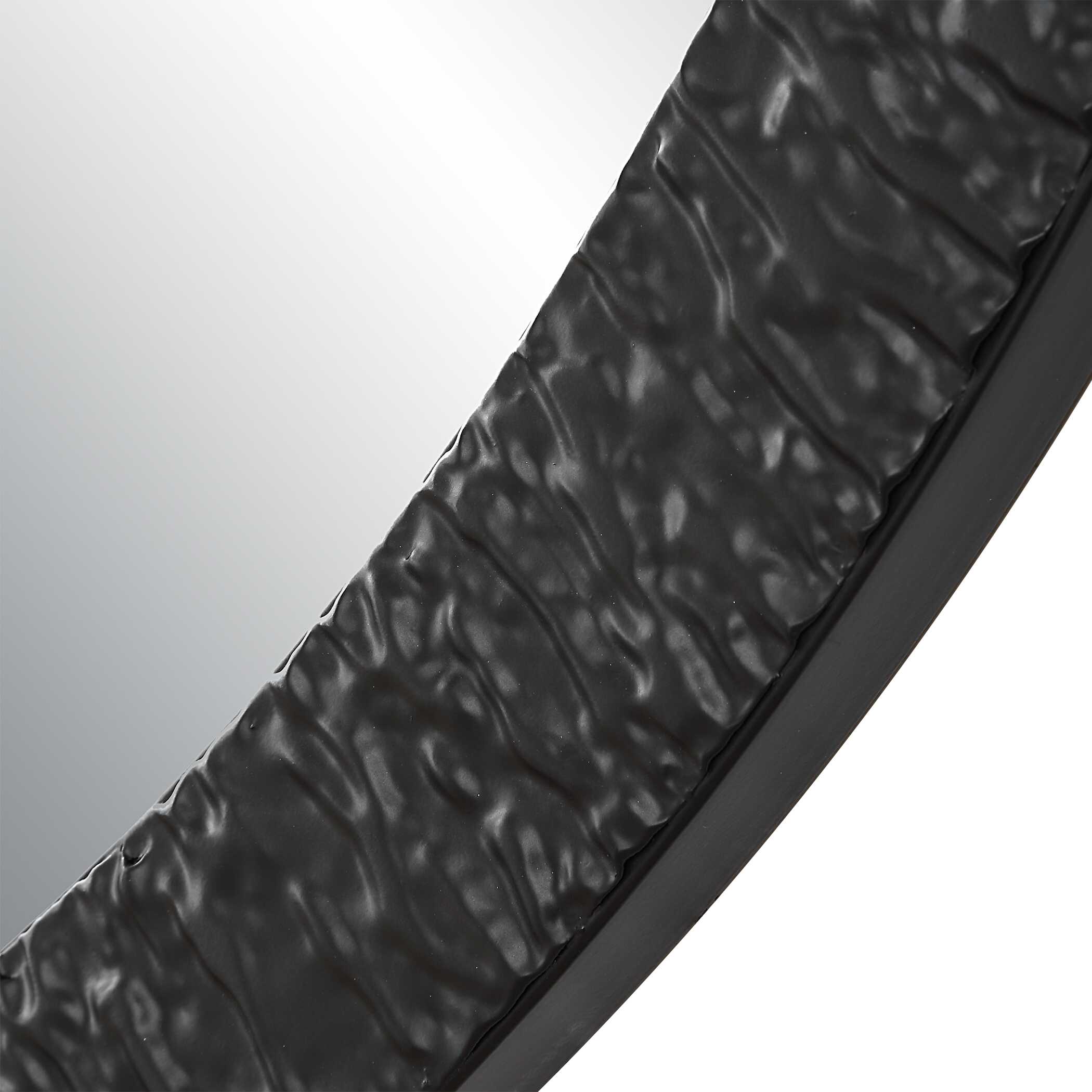This 34" round mirror effortlessly combines functionality with artistry, featuring a plain mirror adorned by a uniquely textured iron frame. The texture, characterized by raised, wavy lines, adds depth and intrigue. The satin black finish will complement any contemporary space.