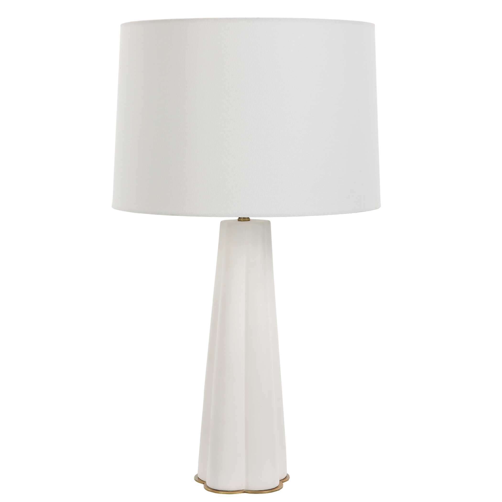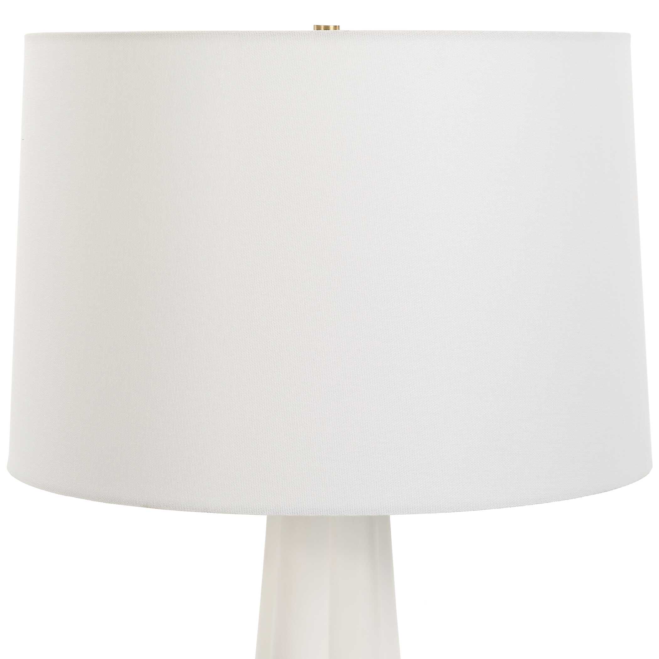 With its captivating round design and rich blue hue, this ceramic table lamp adds a pop of color and personality to any room. The square raised features on the body lend a unique texture, creating visual interest and depth. A thin, antique brass, metal band separates the lamp's body. The round shade is a white linen fabric.