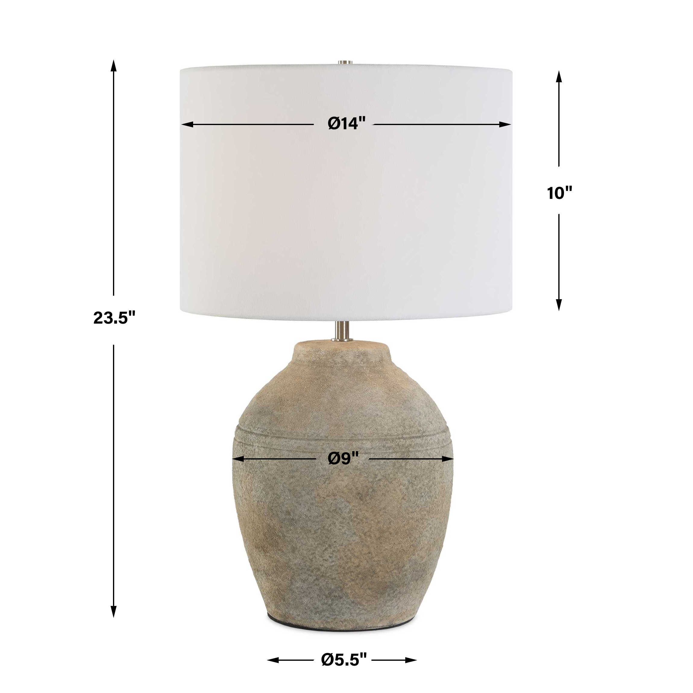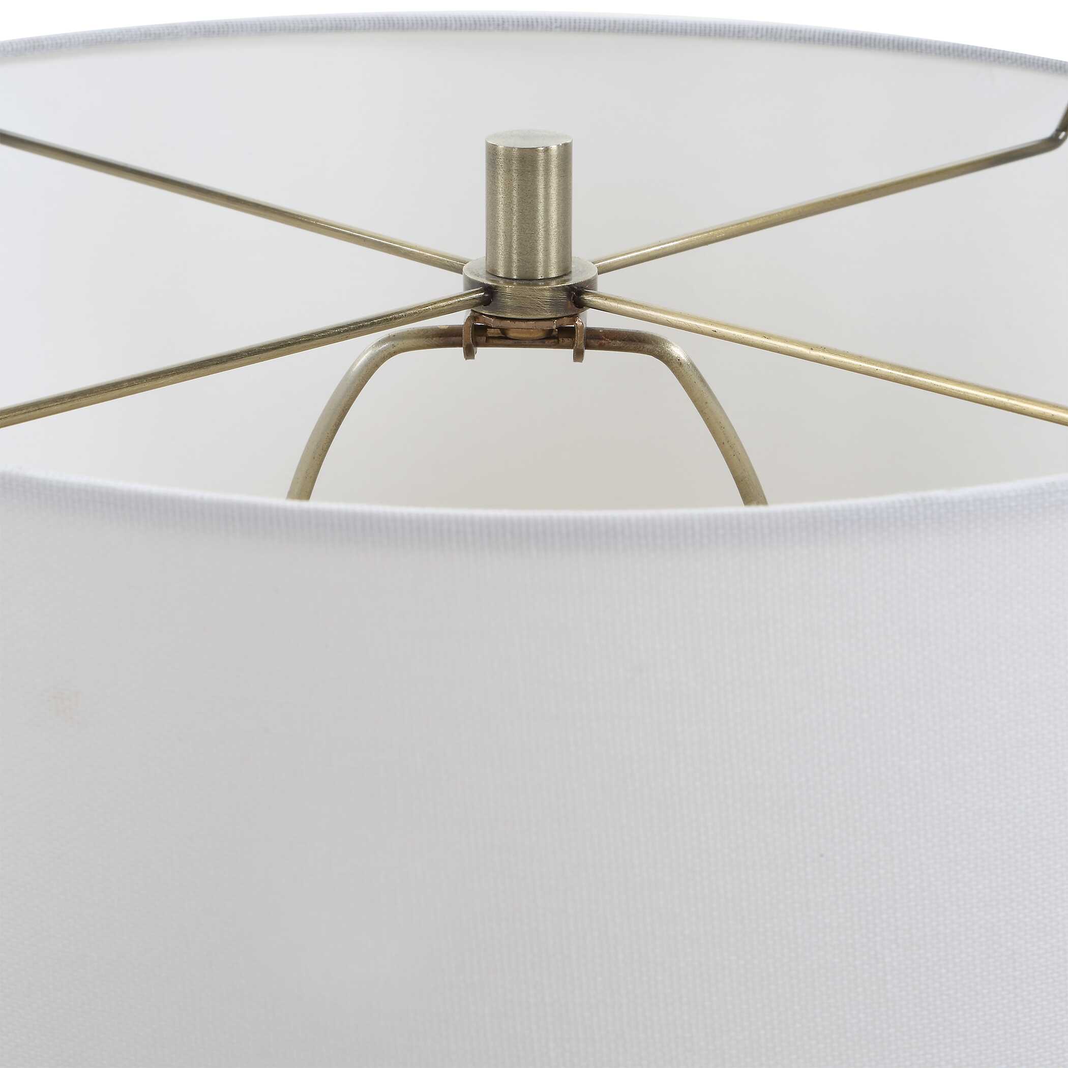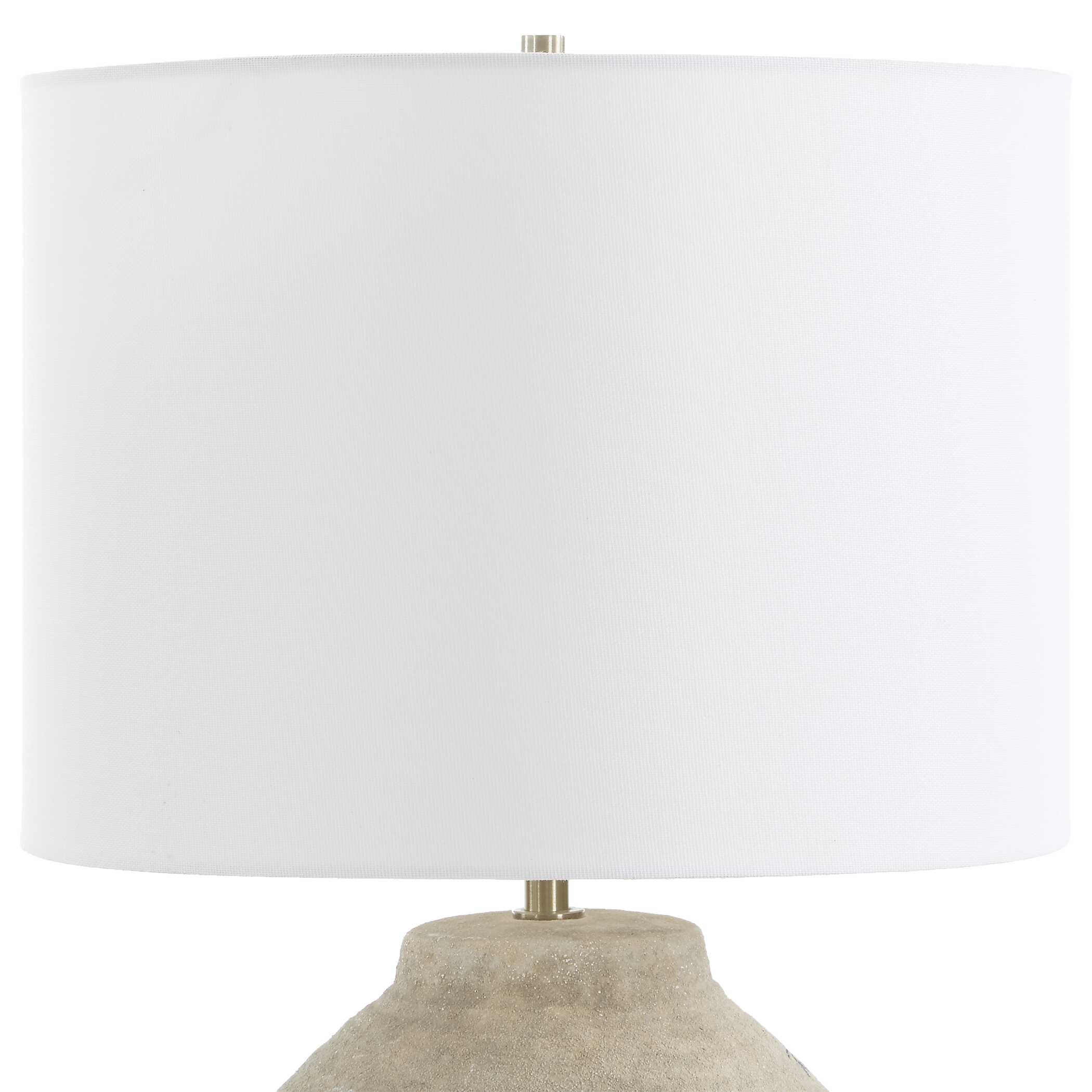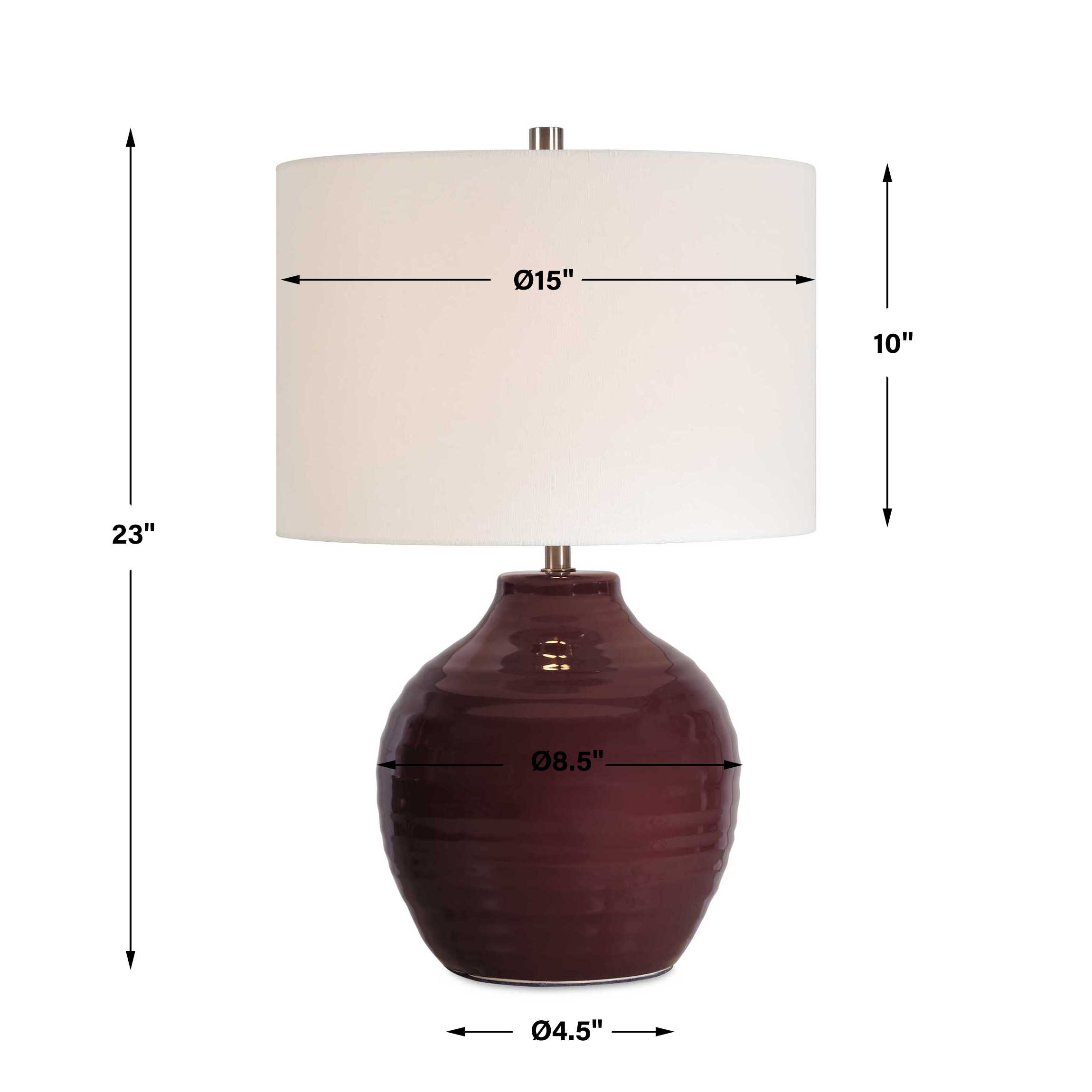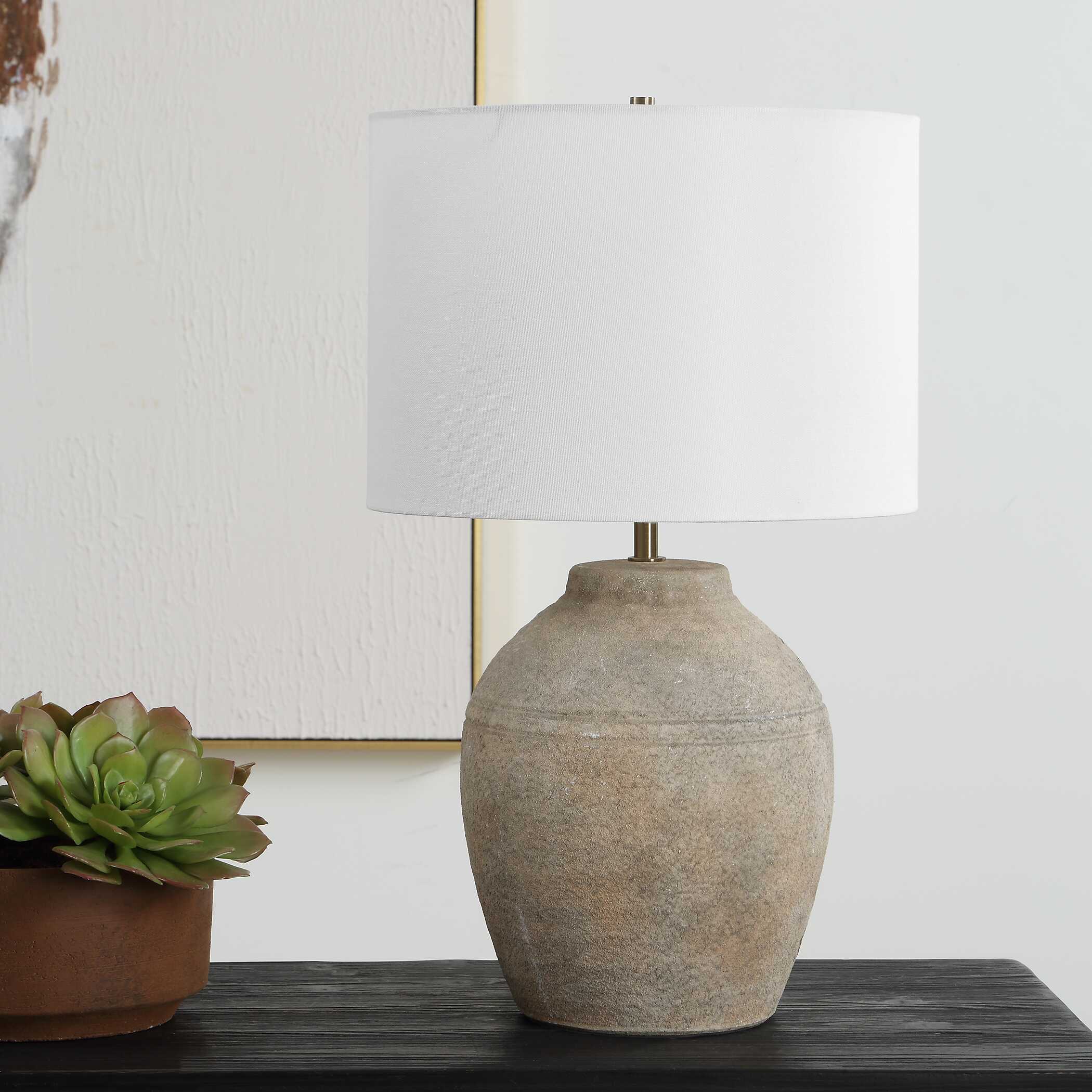 The beautifully textured ribbed ceramic body of this table lamp is enhanced with a rich olive green finish. Antique brass accents complement the green hue, providing a serene, earthy vibe to any room. The shade is an off-white linen fabric, adding to the warm, inviting glow.