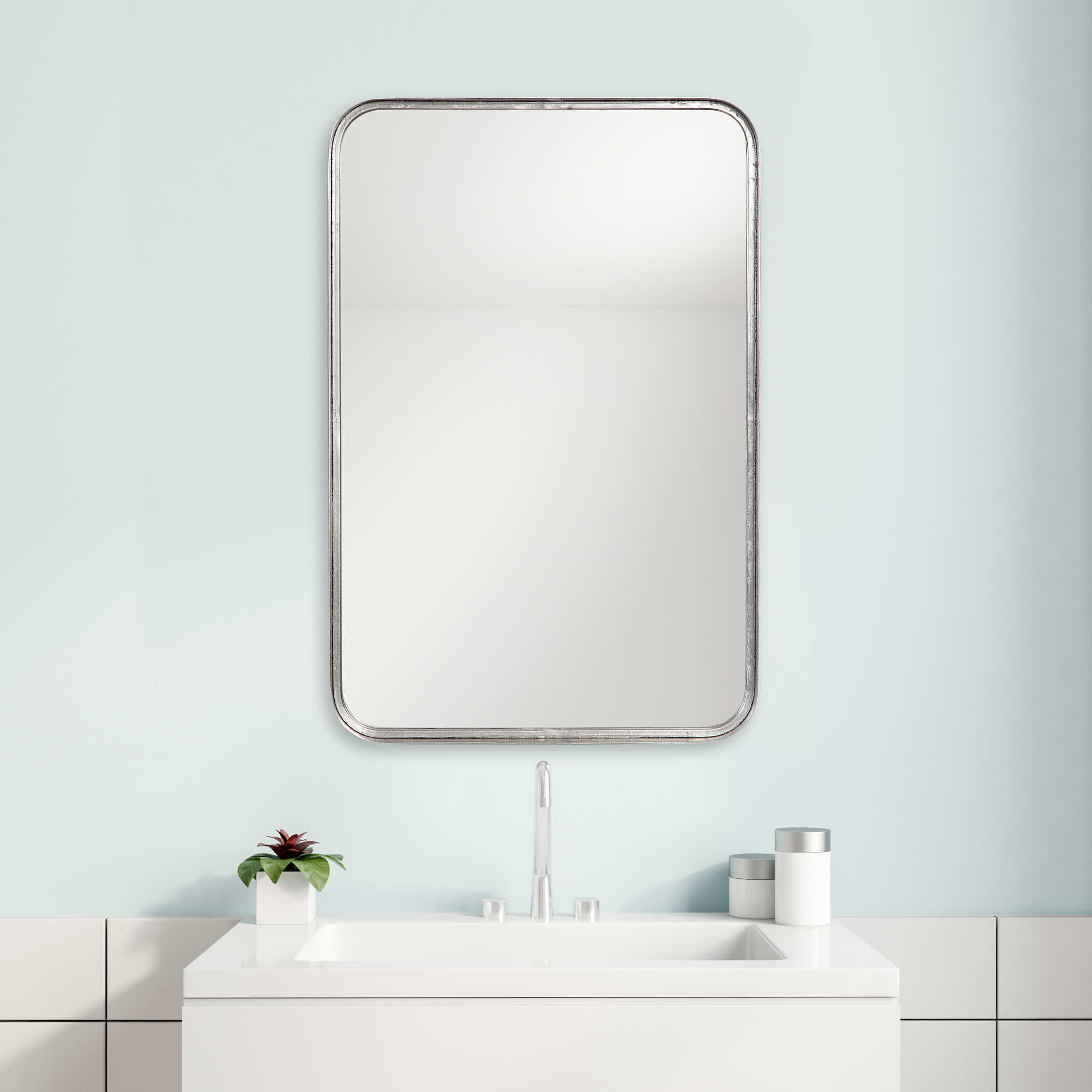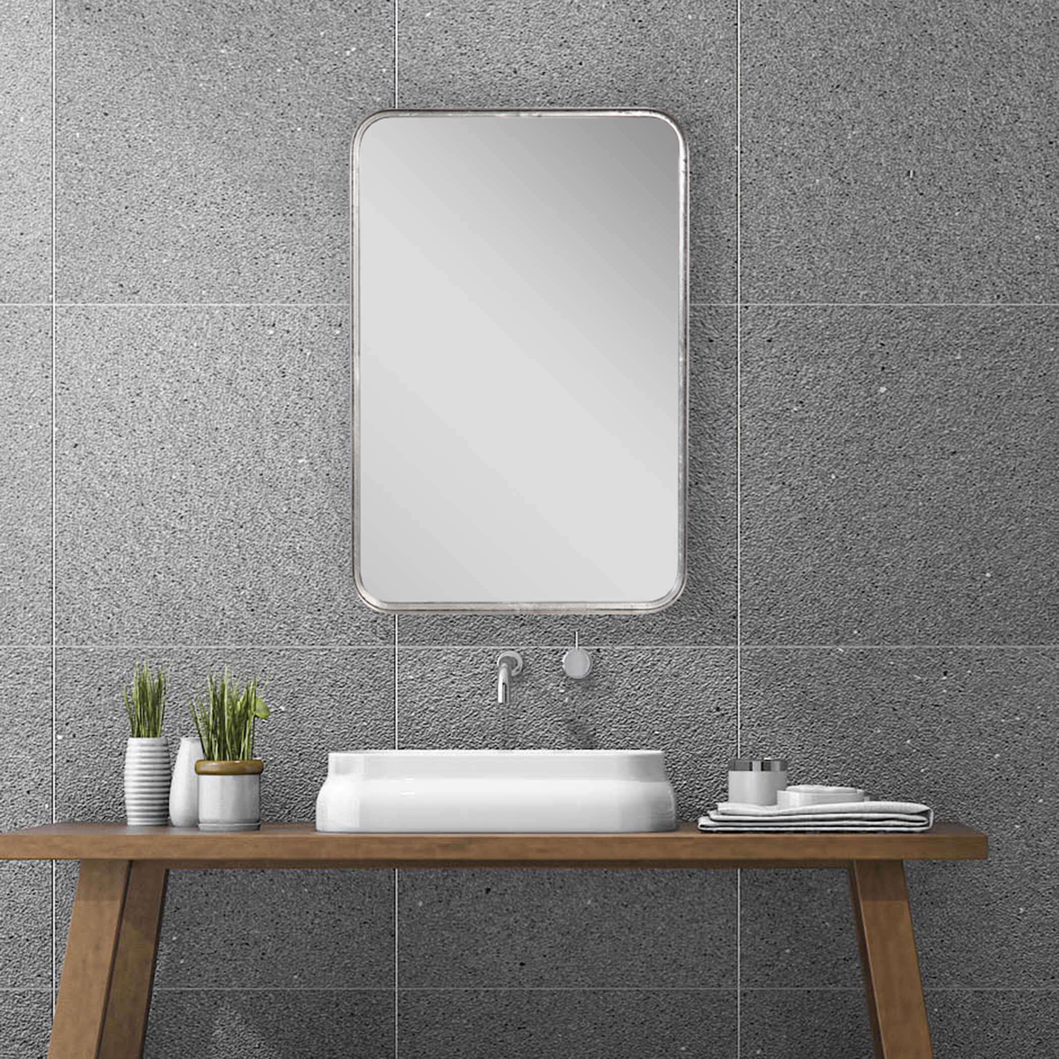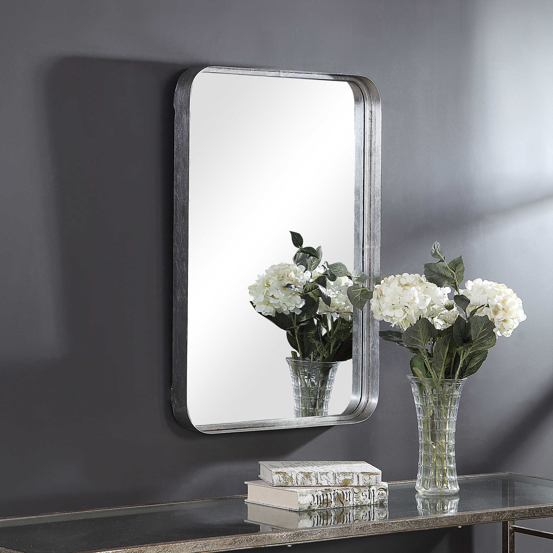 This frame features mirror inlays, separated by thin, grooved framing strips, finished in a metallic silver. The center mirror has a 1" bevel. This frame may be hung either vertically or horizontally.