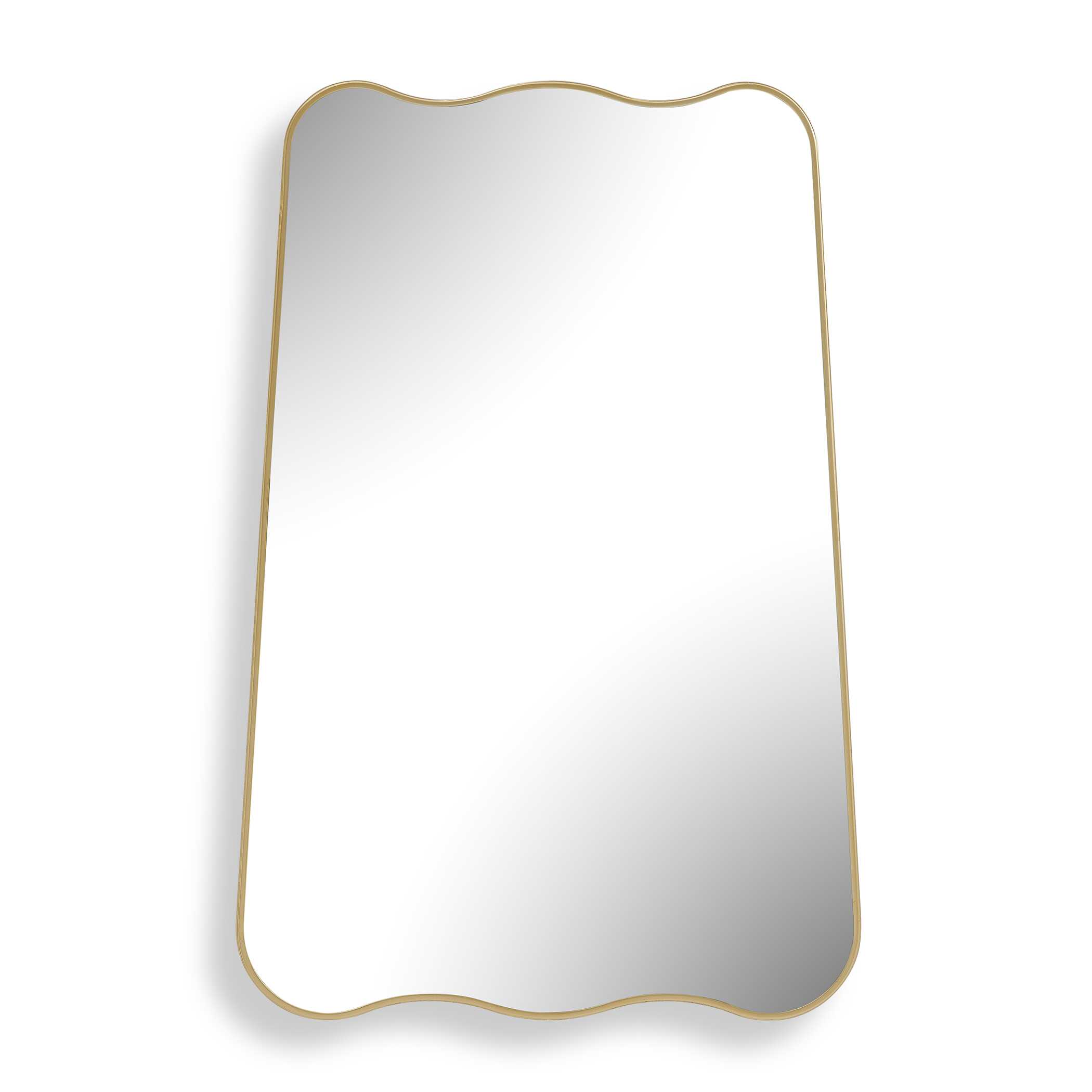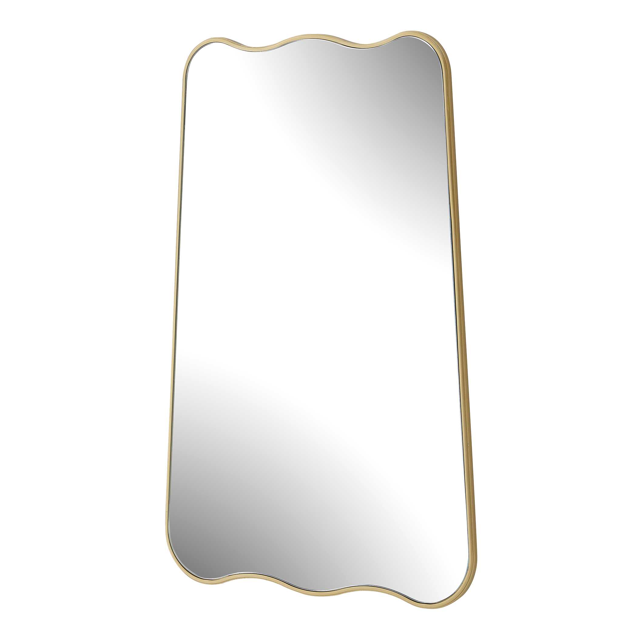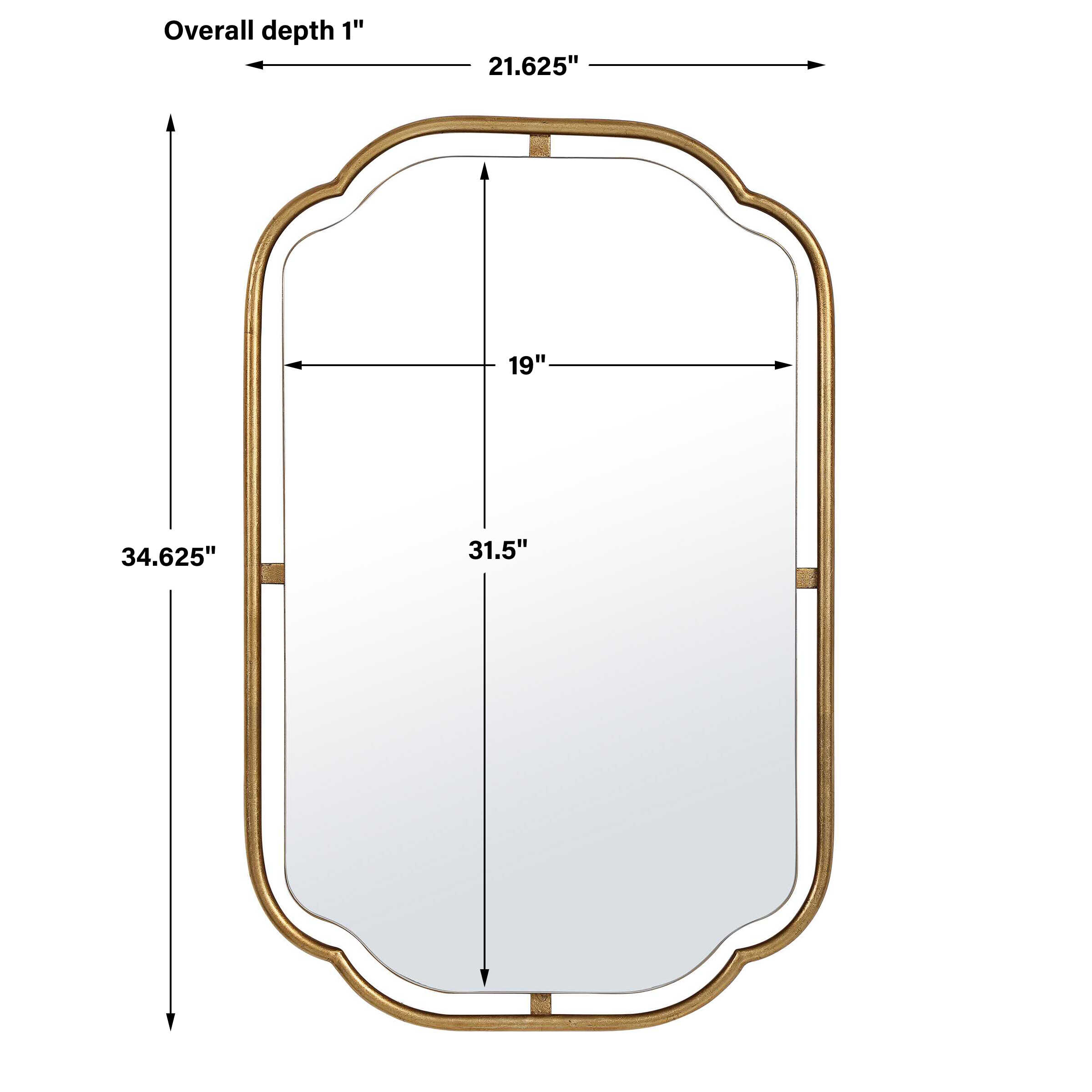 Featuring a gracefully arched top and bottom with sleek, straight sides, this mirror is a perfect blend of contemporary style and classic charm. The iron frame, finished in a warm brushed gold, surrounds a floating mirror, appearing as though it is suspended within the frame. May be hung either vertically or horizontally.