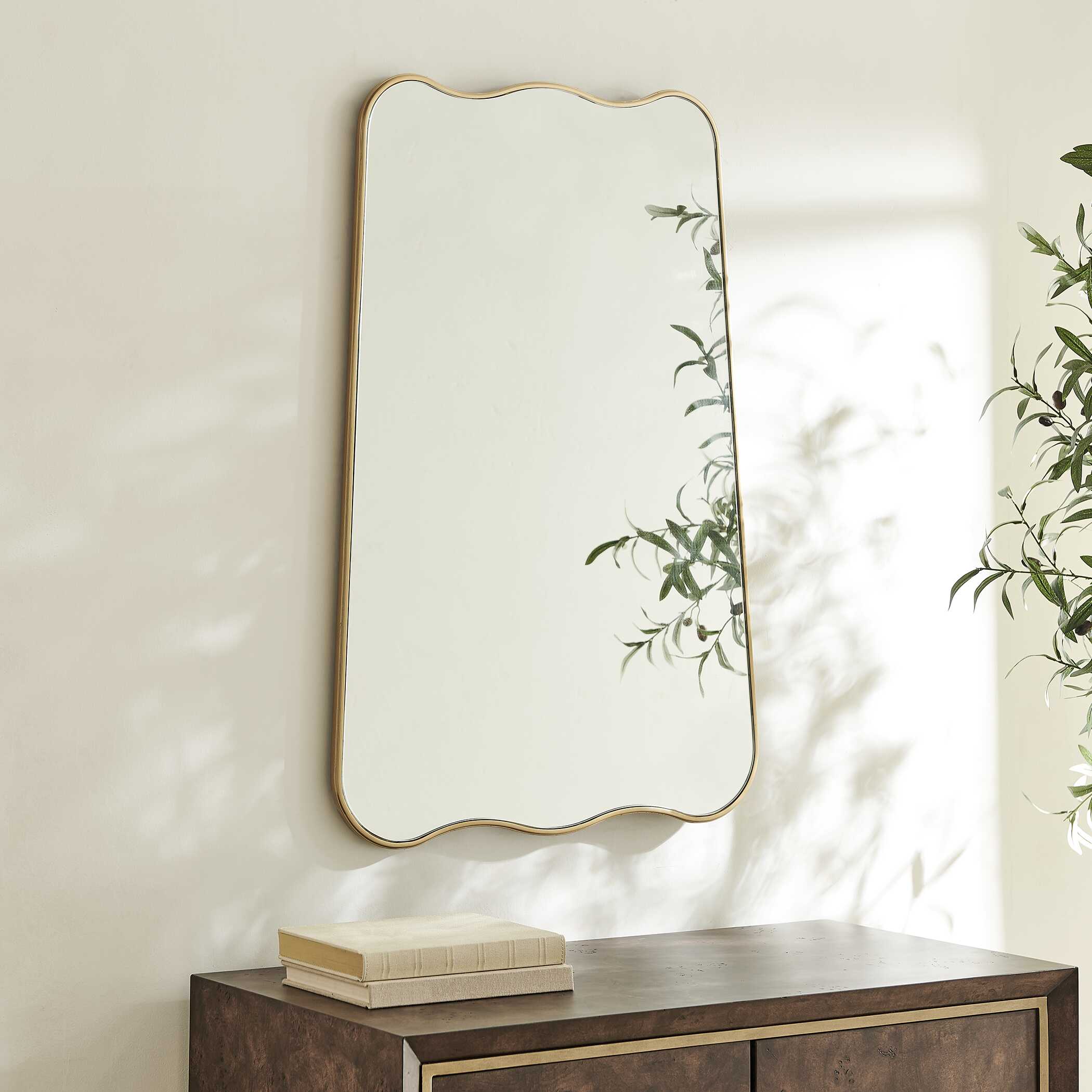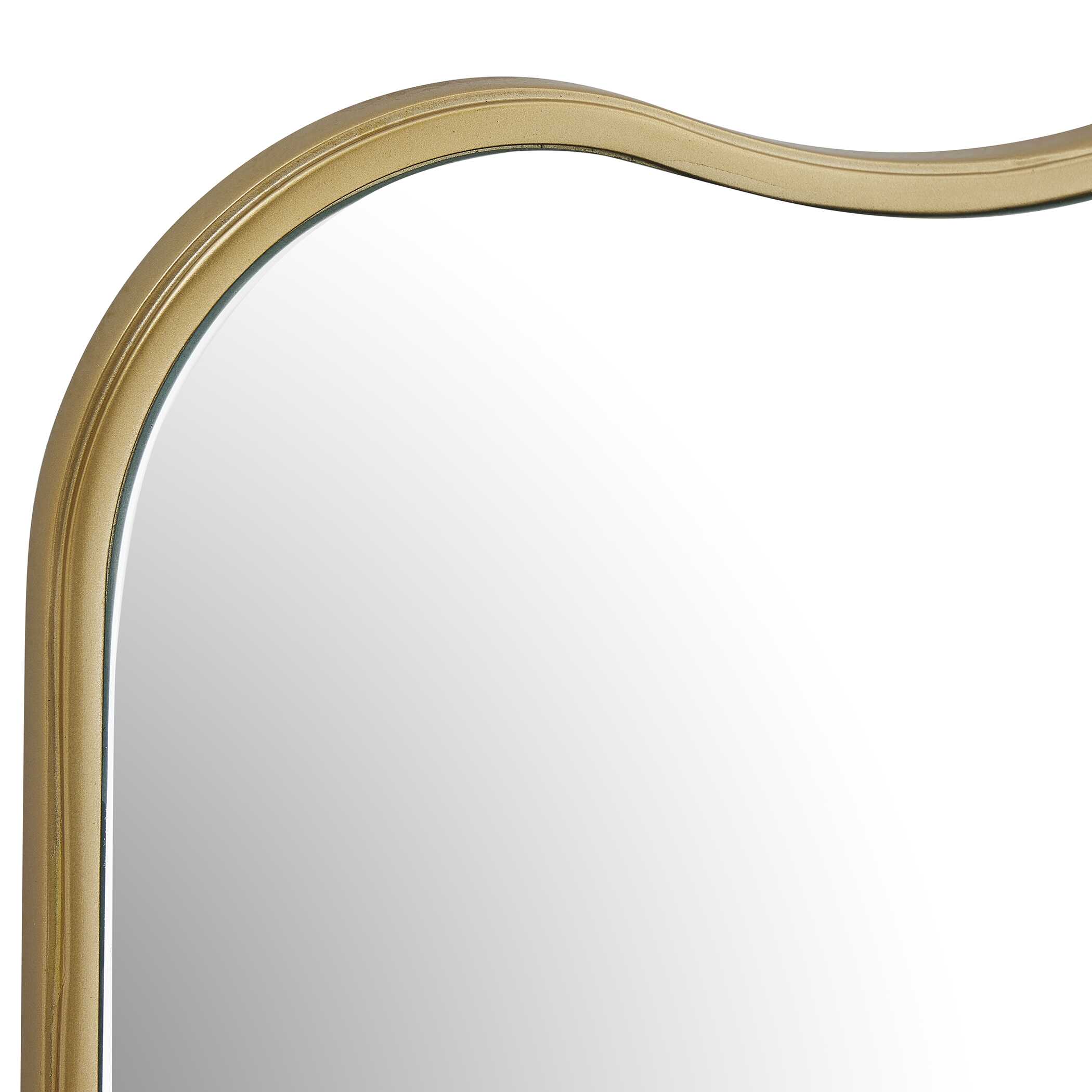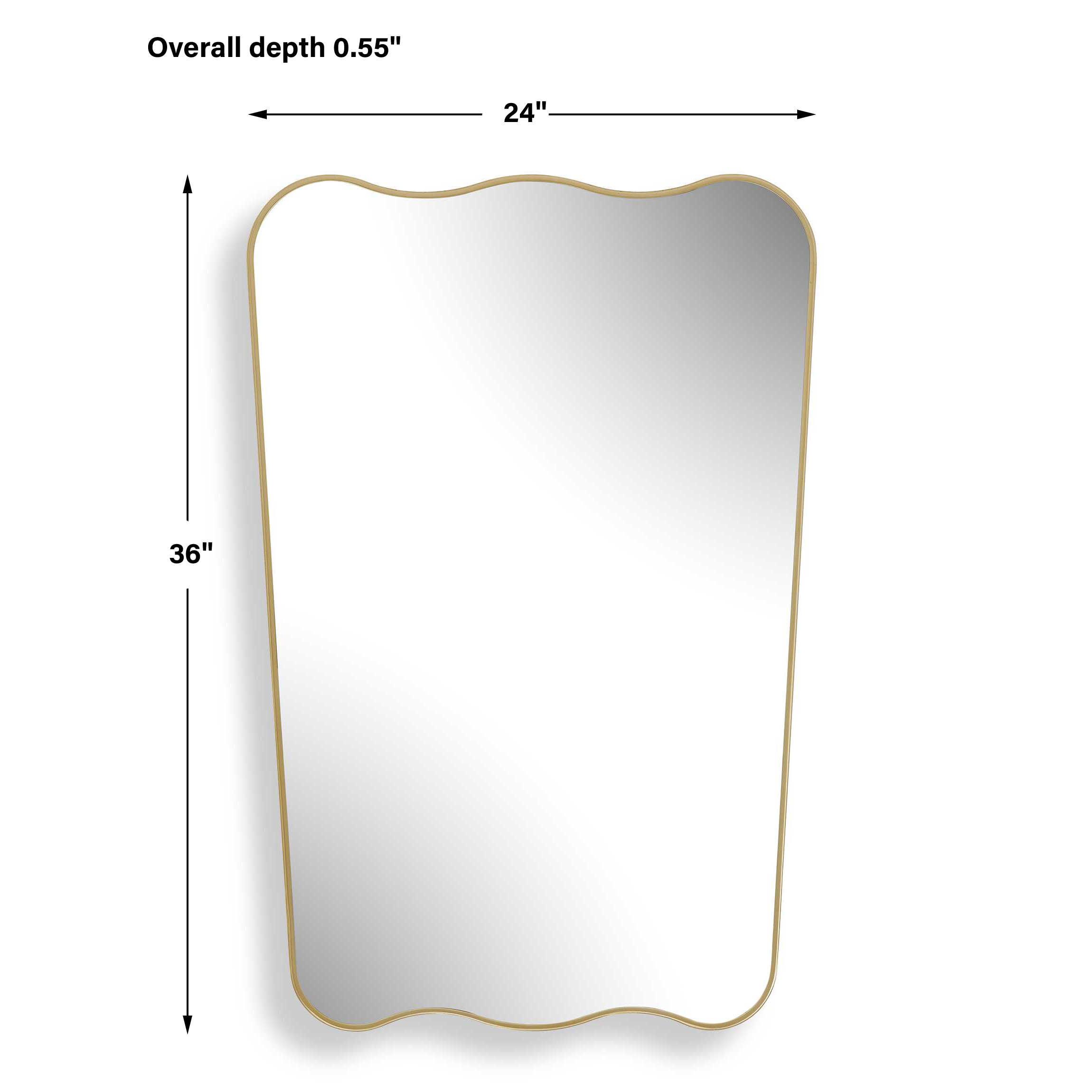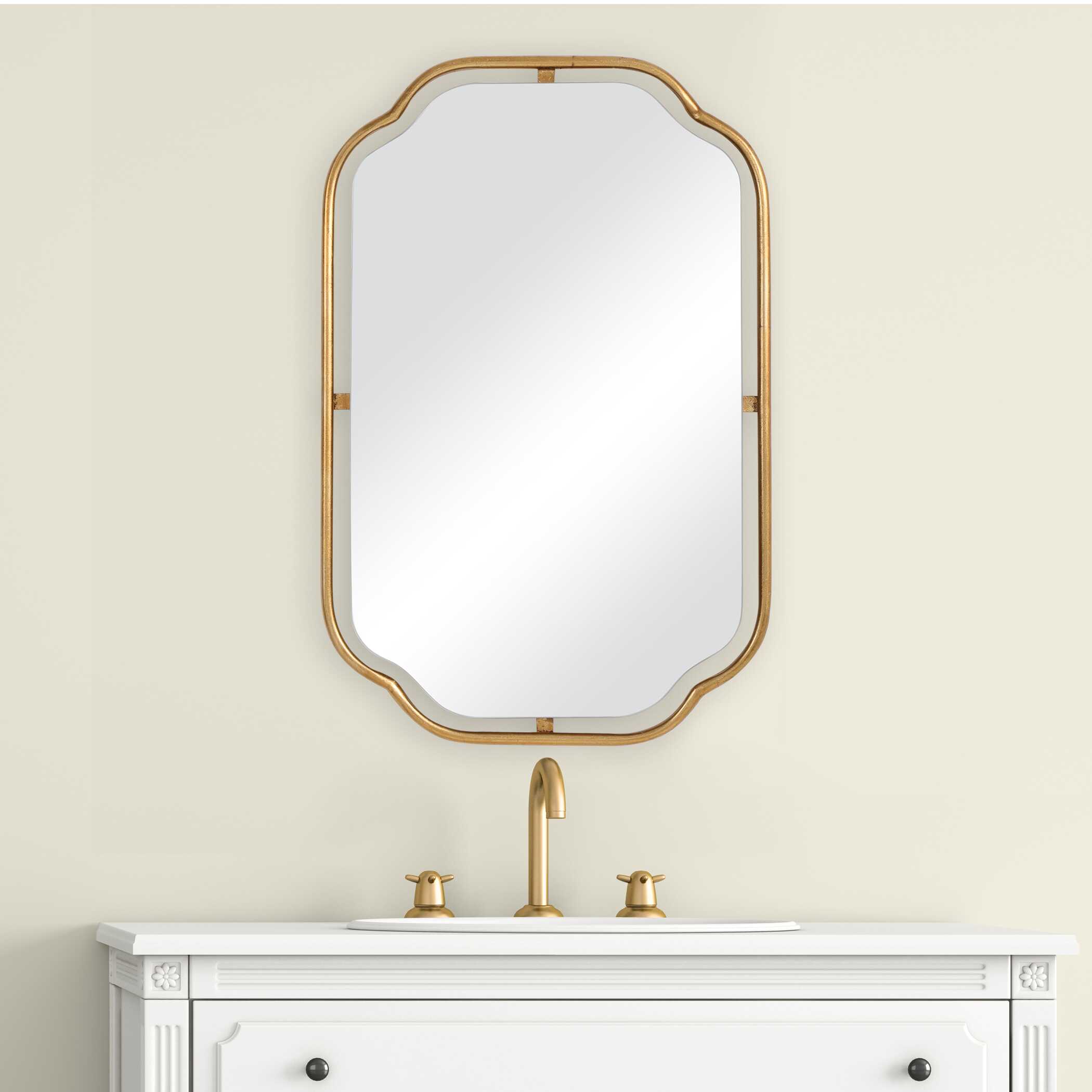 Featuring a gracefully arched top and bottom with sleek, straight sides, this mirror is a perfect blend of contemporary style and classic charm. The iron frame, finished in a warm brushed gold, surrounds a floating mirror, appearing as though it is suspended within the frame. May be hung either vertically or horizontally.