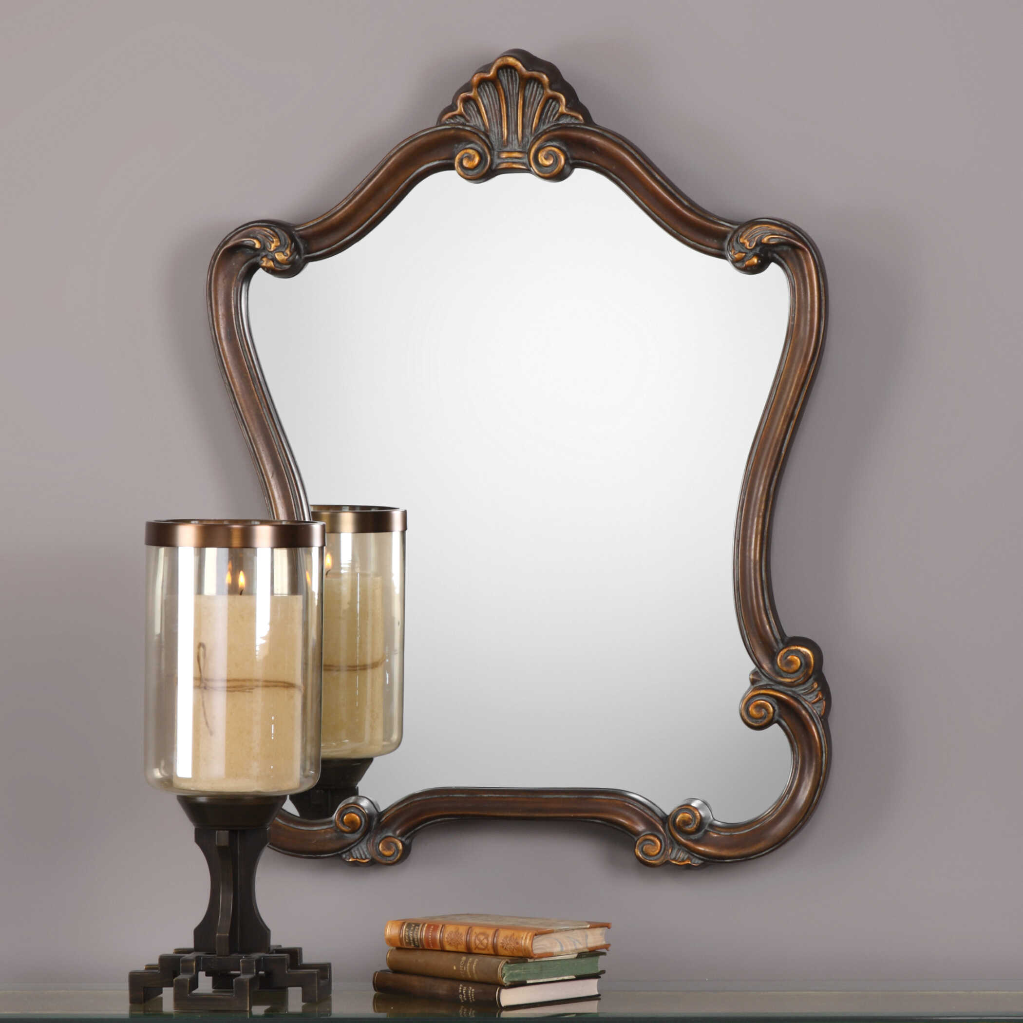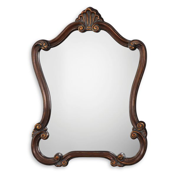 This traditional frame is characterized by its ornate scroll details. It is finished in a lightly distressed bronze.