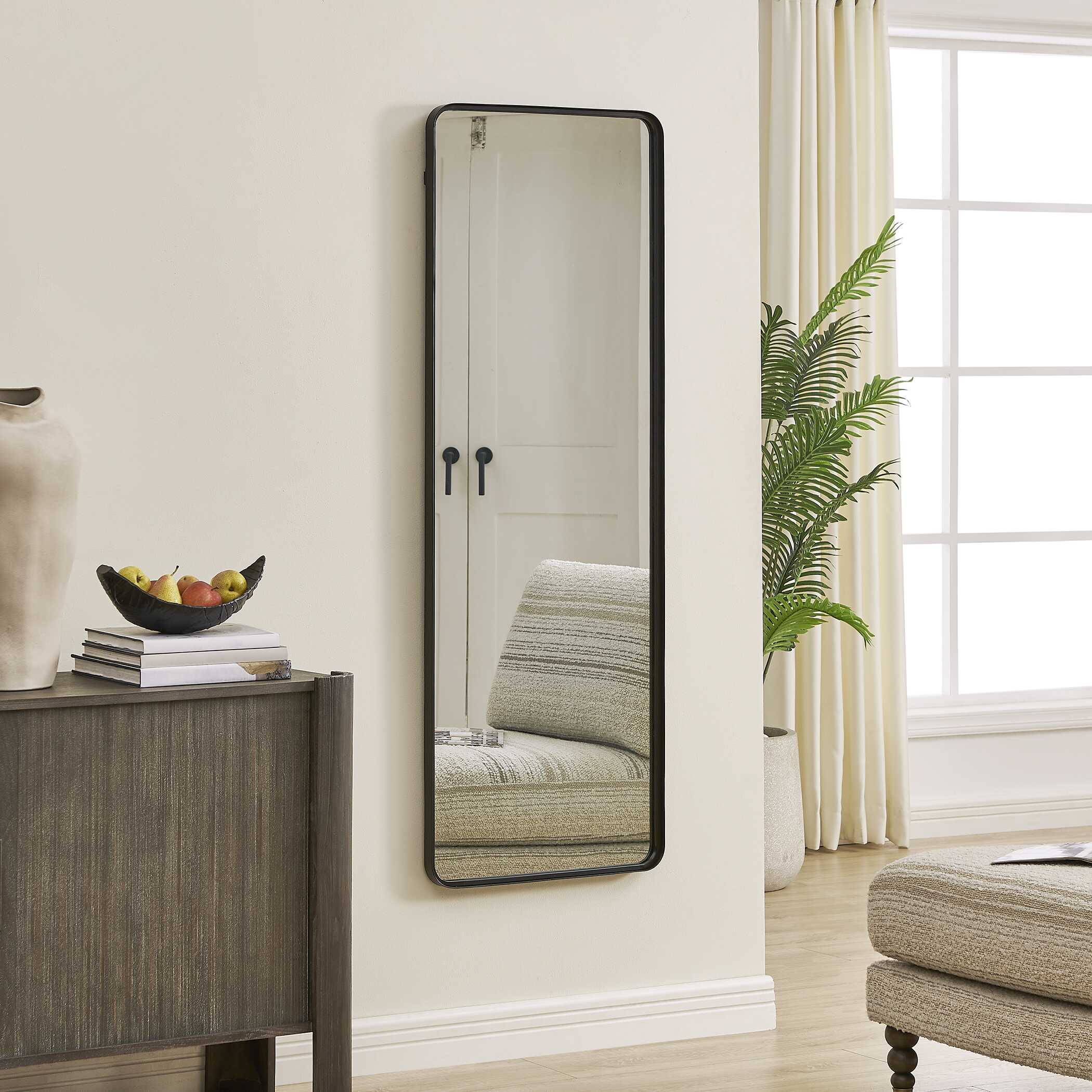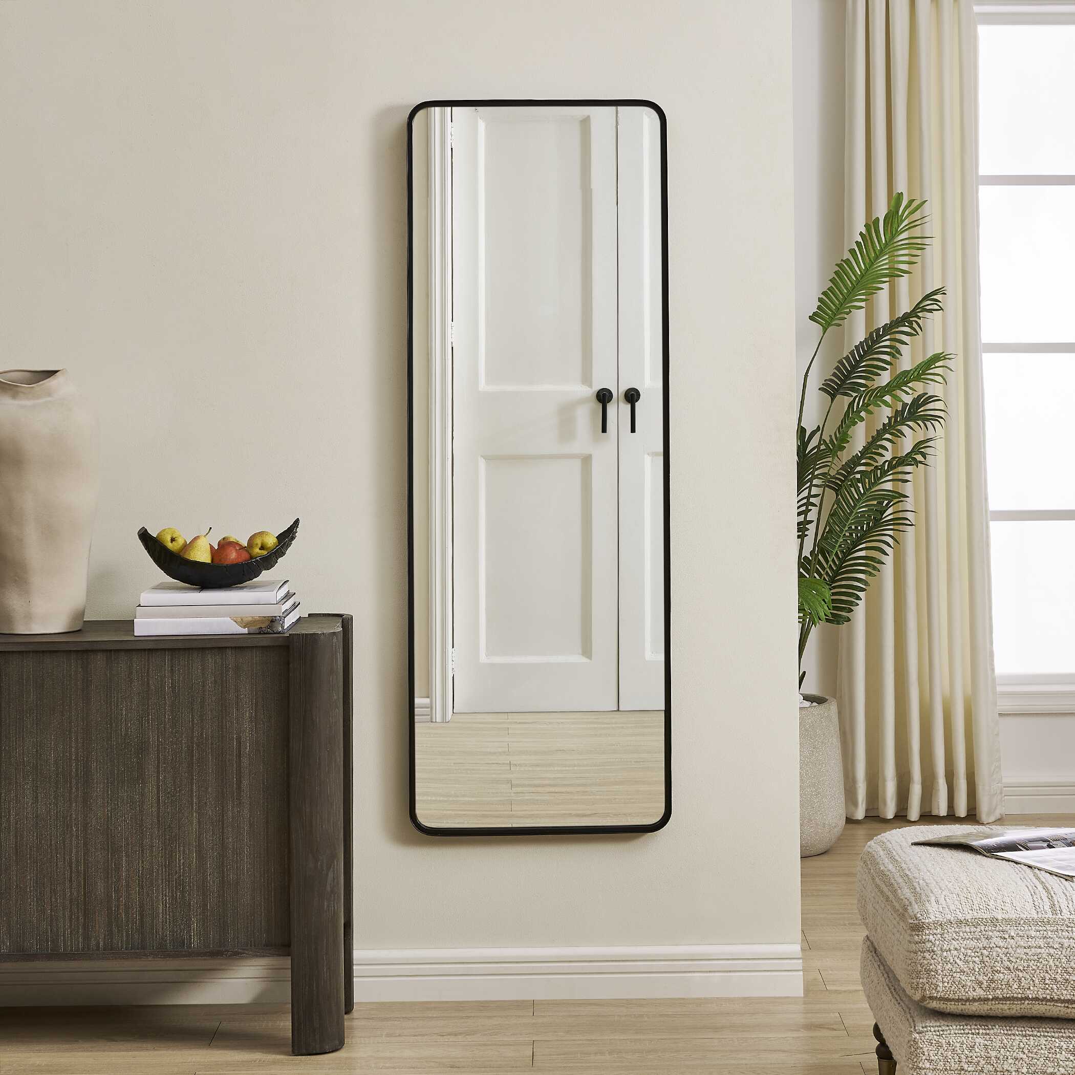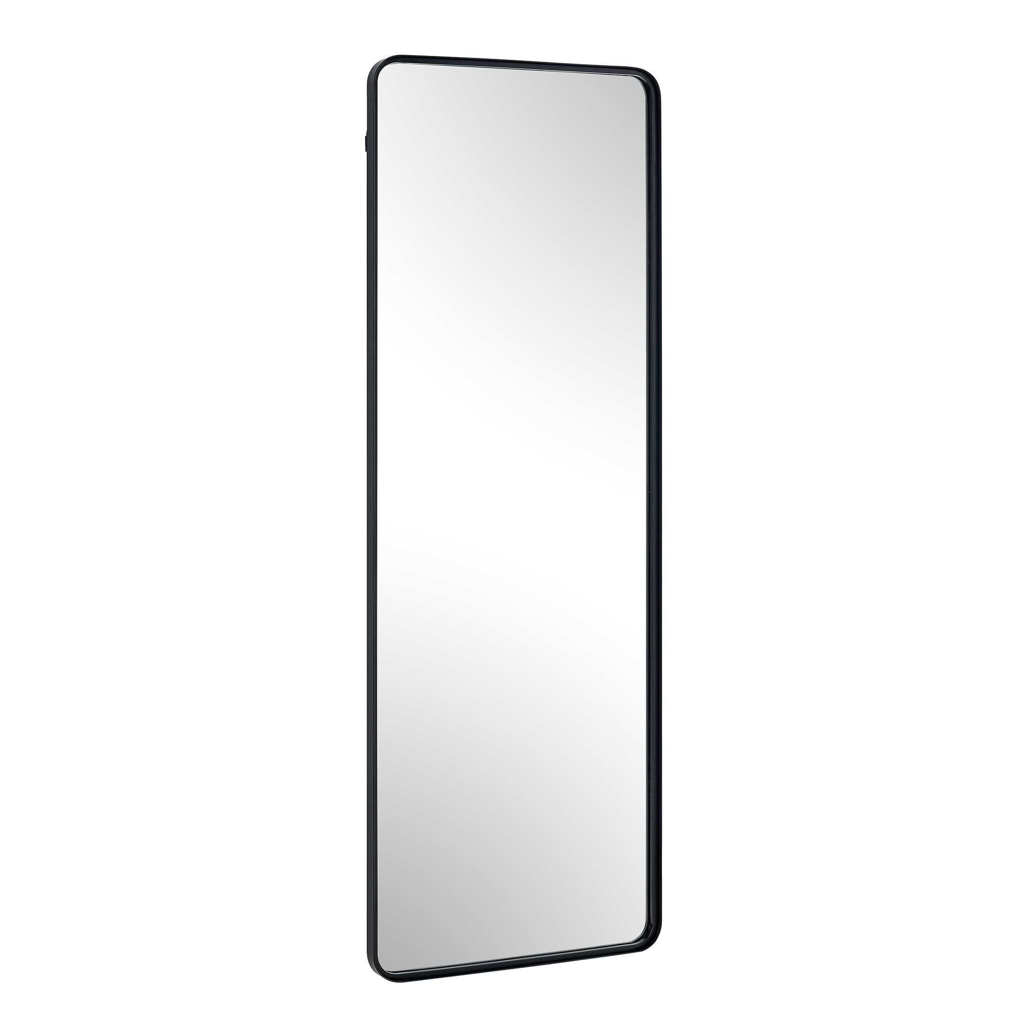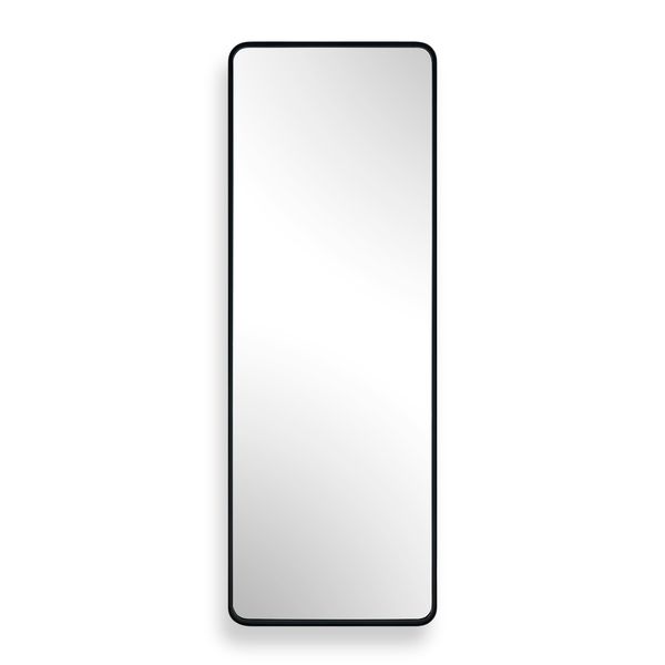The soft rounded corners of this rectangular mirror give a refined, contemporary look, while the satin black finish adds a modern edge. The beautifully crafted profile features an inset trim that introduces subtle depth and dimension. This mirror blends clean lines with thoughtful detail, offering both function and a timeless design. May be hung vertically or horizontally.