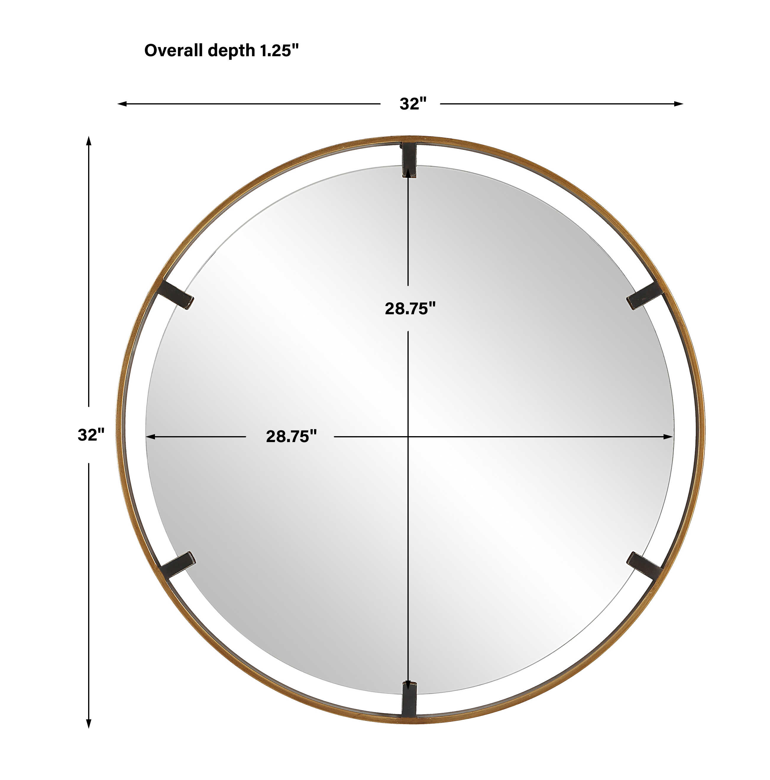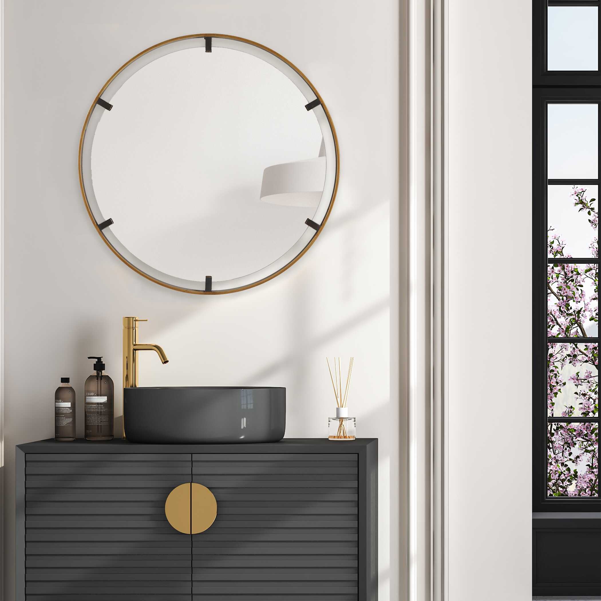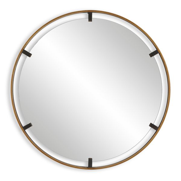 This 34" round mirror, made of aluminum, is finished in a brushed gold. Whether you are updating a foyer or a bathroom, the simple, clean design will give any space a refreshed look.